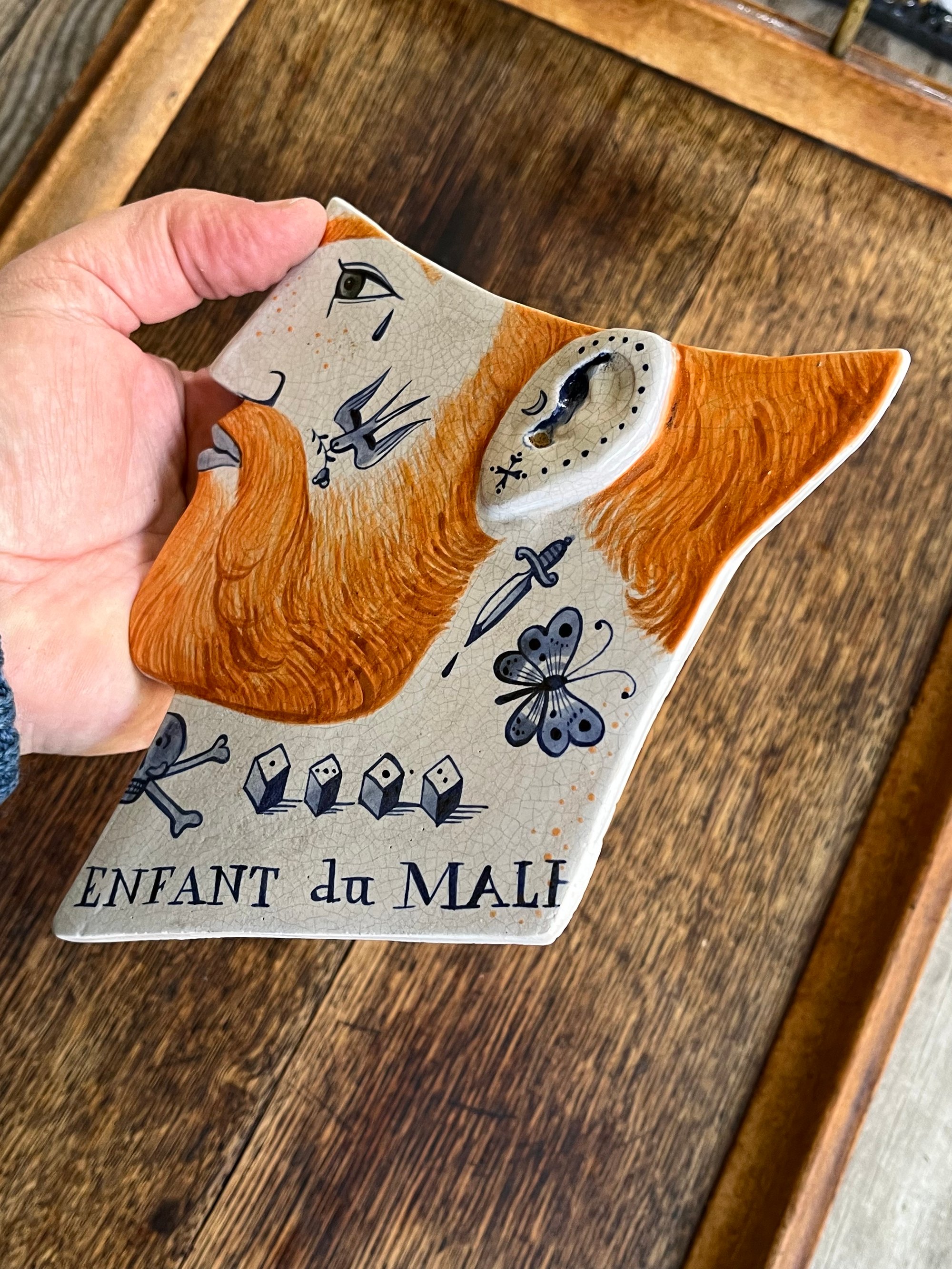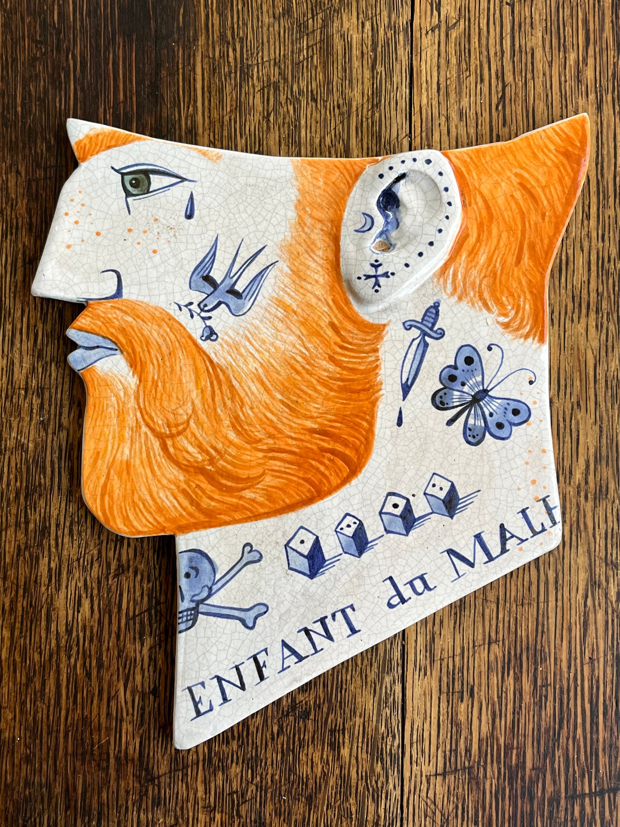 The face of a tattooed ginger bad boy, un mauvais garçon. Glazed ceramic plaque in Cobalt and Polychrome, with sculpted bas-relief ear. Inspired by traditional French prisoner tattoos.