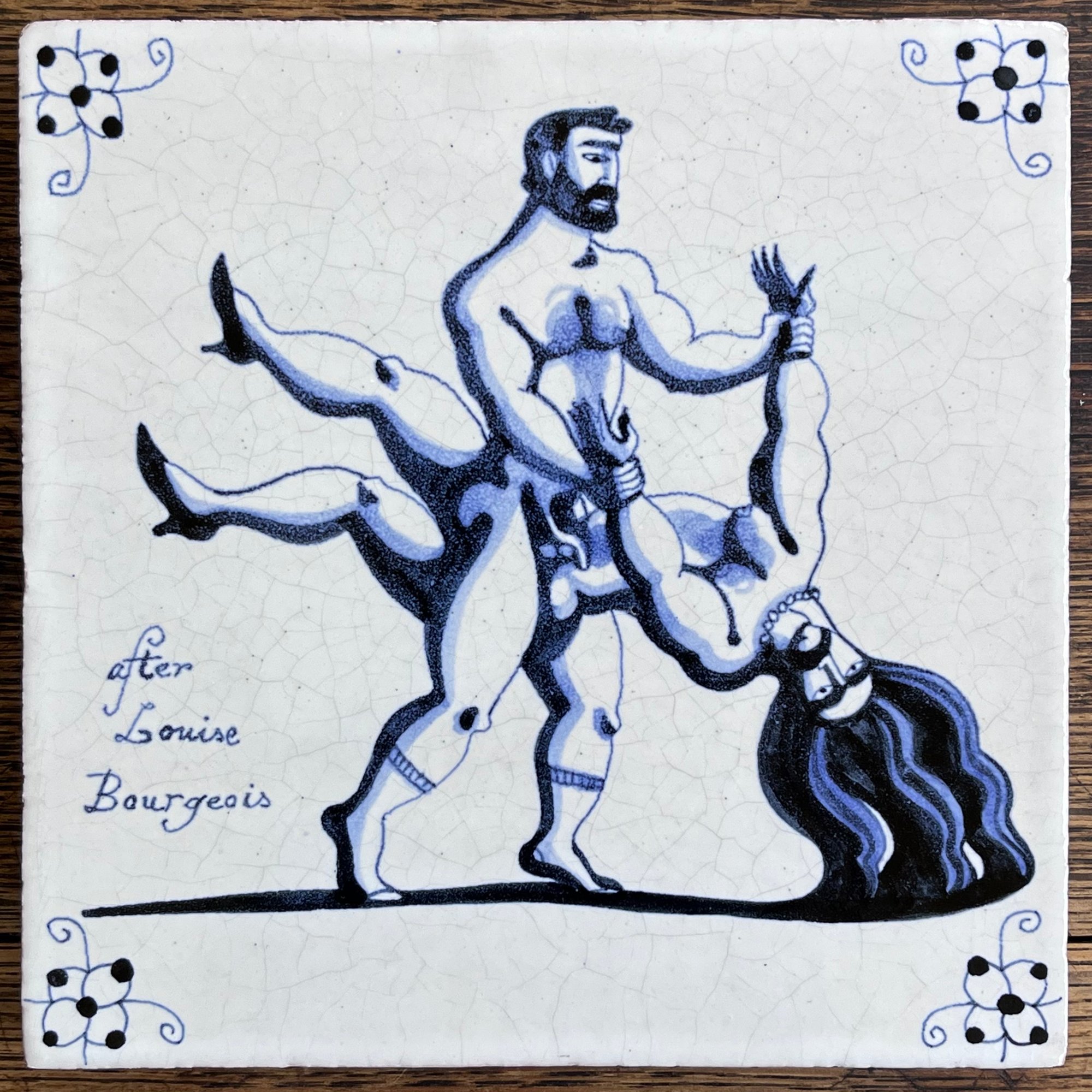 A questioning of the power dynamics of traditional relationship roles. Hand-painted delft tile in Cobalt, with spider head corner motifs. Inspired by a drawing by French artist Louise Bourgeois.