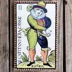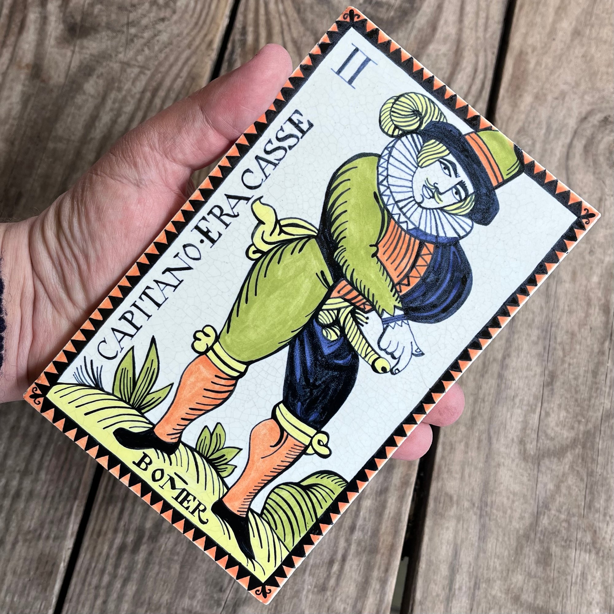Capitano Eracasse, a swaggering Spanish soldier from the Commedia del'Arte. Hand-painted delft tile in Cobalt and Polychrome, inspired by the traditional 'Swiss' Tarot. Please note a slight bowing of the piece overall, reflected in the price.