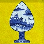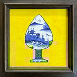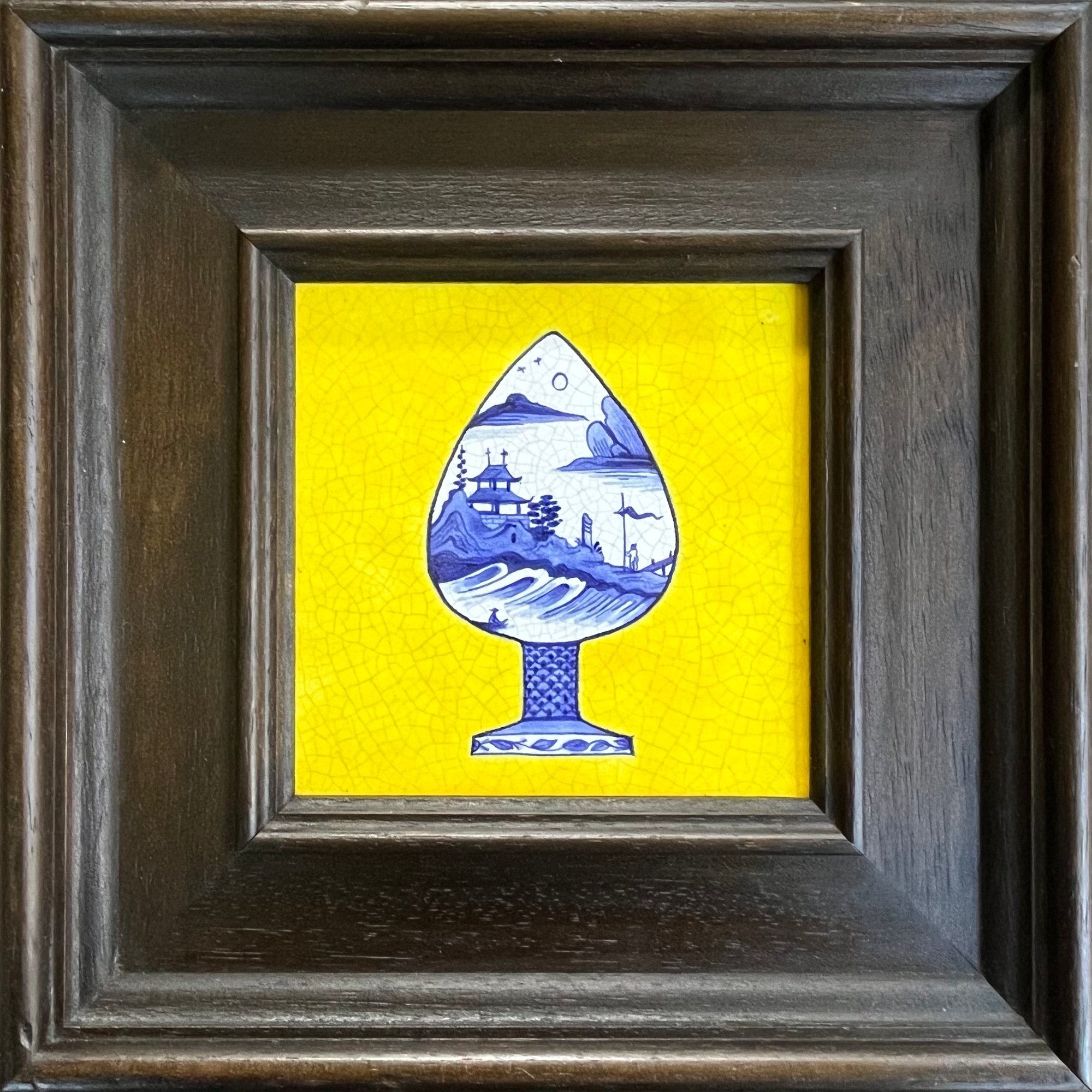 An ornately painted Chinoiserie buttplug on an Imperial yellow ground, showing a waterside scene. Quality wooden-framed hand-painted delft tile in Cobalt and Polychrome, inspired by a traditional Chinese design.
