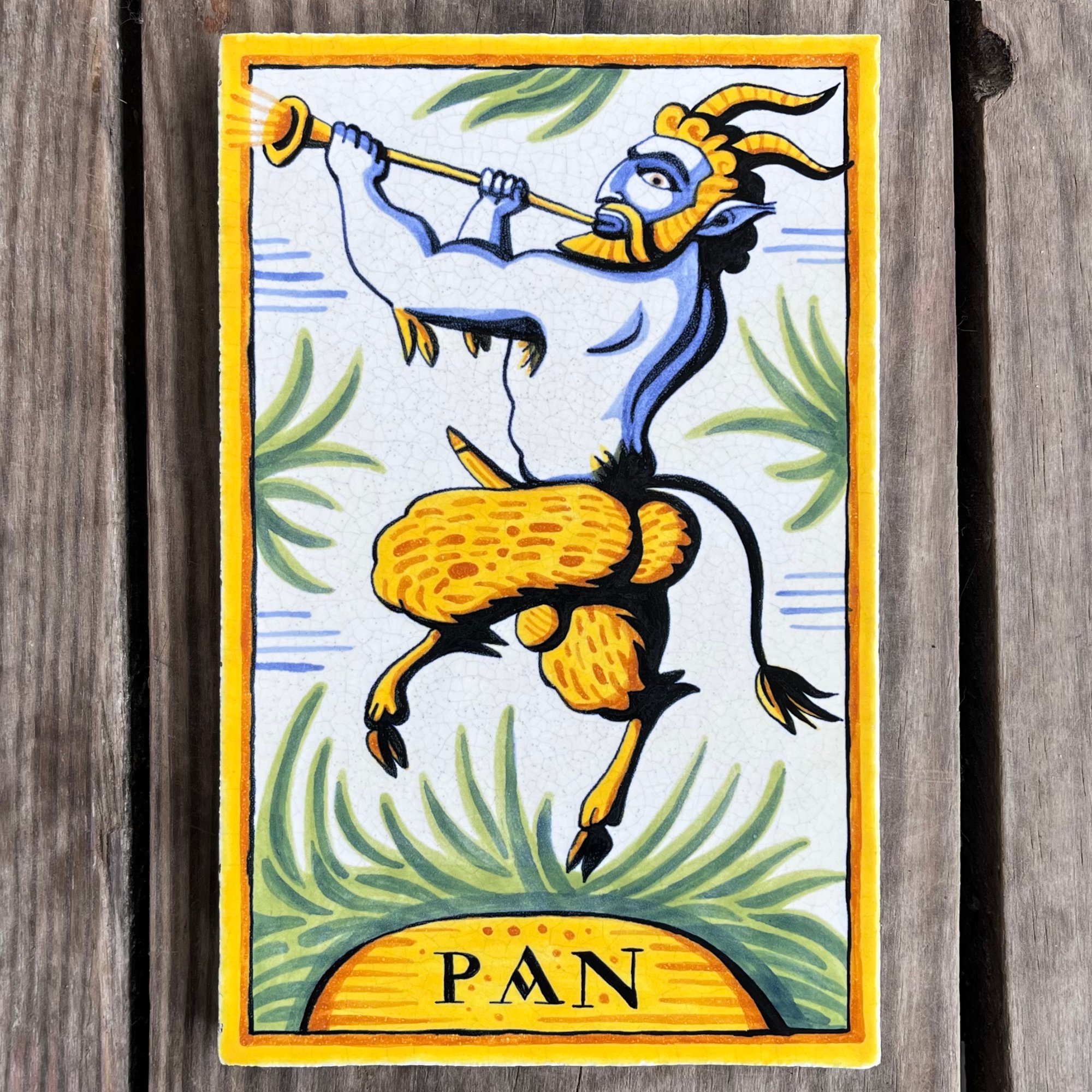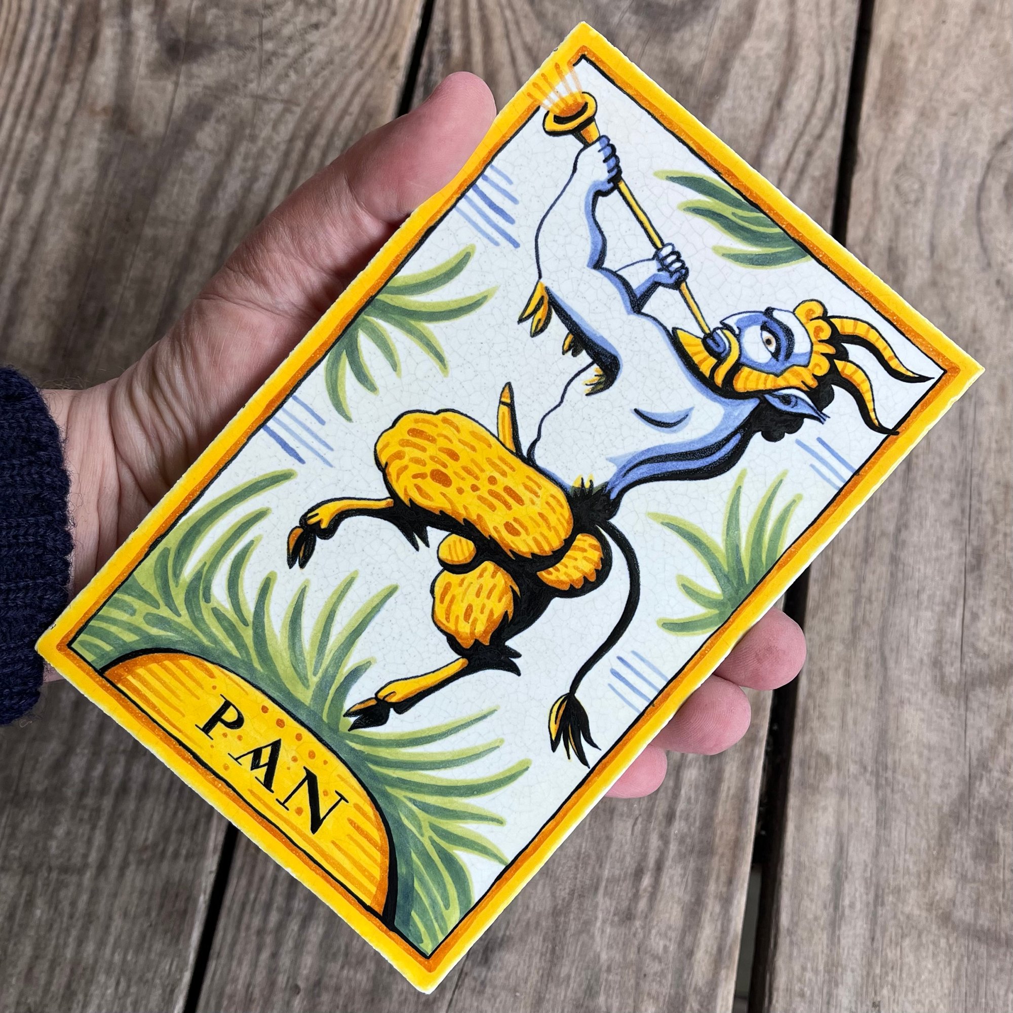 The Great God Pan, with horns aloft, dancing upon a tussock. Hand-painted delft tile in Cobalt and Polychrome. Inspired by traditional Spanish tile designs.