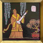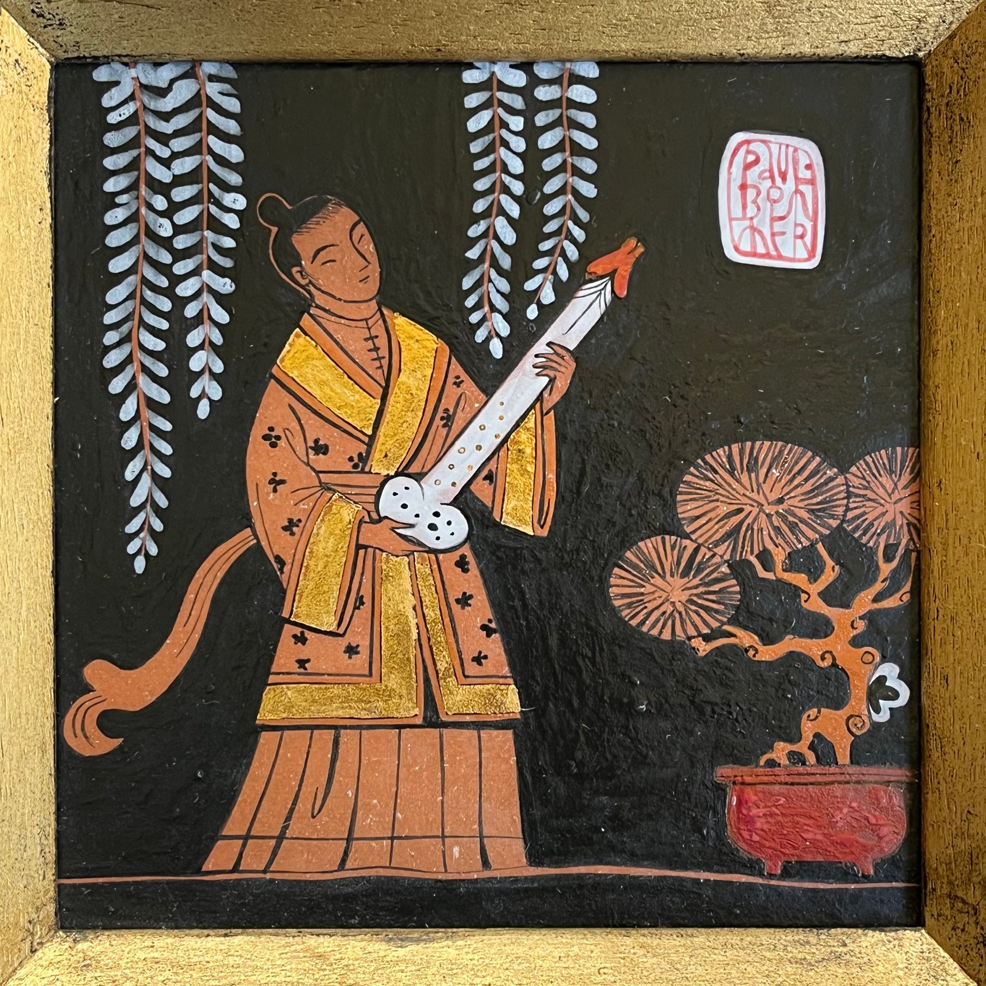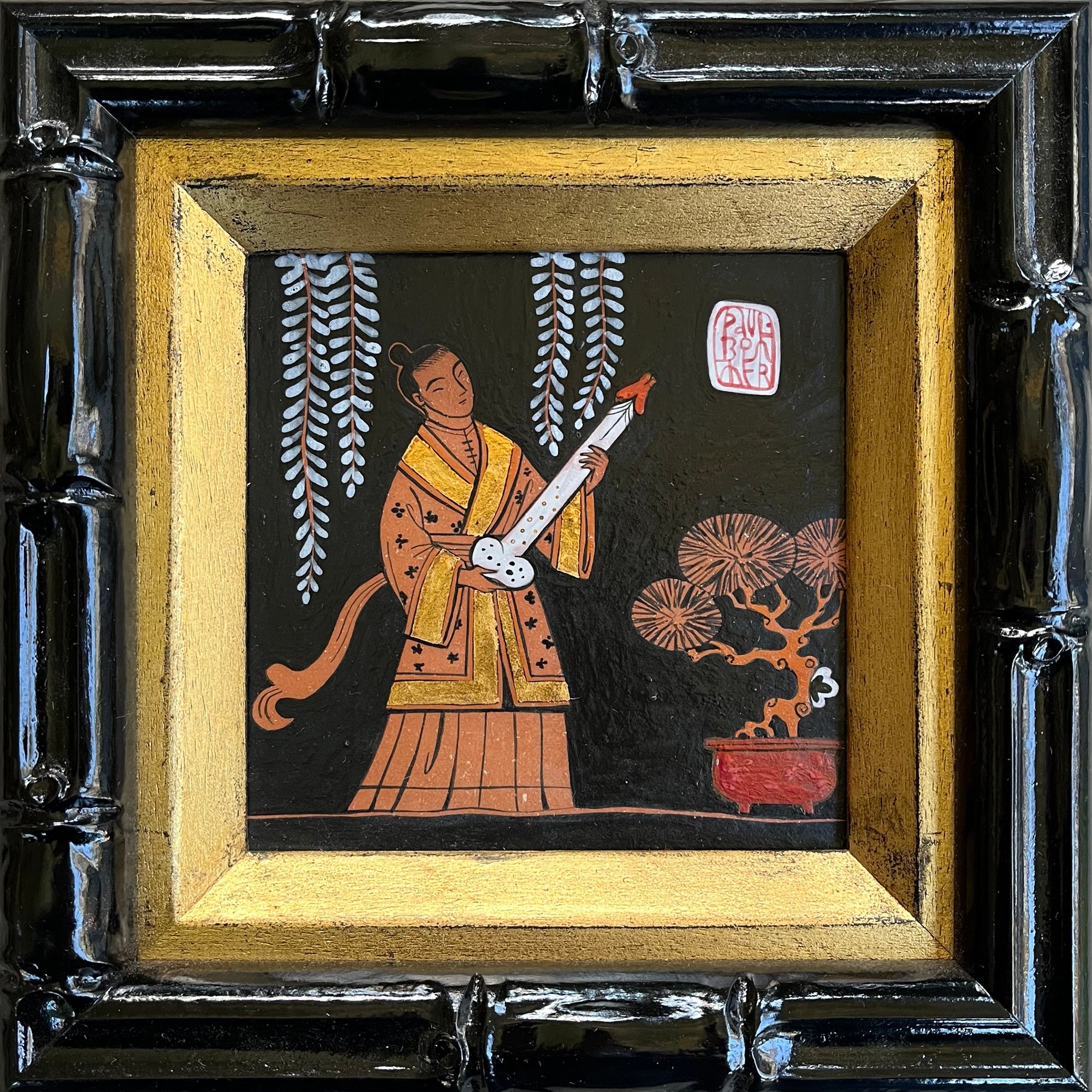 A young Man inspecting an ornate carved ivory Love Toy. Quality wooden-framed hand-painted red-clay chinoiserie tile in Polychrome glaze and gold lustre, inspired by a traditional Chinese design.