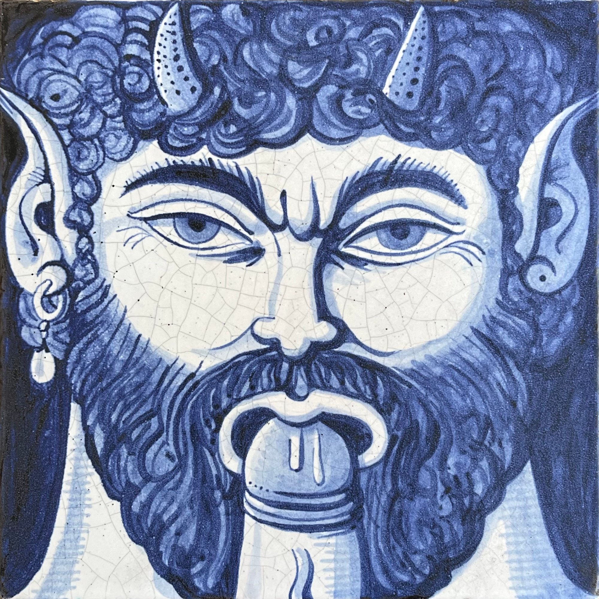 The face of a horny young Faun. Hand-painted delft tile in Cobalt, inspired by a traditional Rotterdam delft tile form.