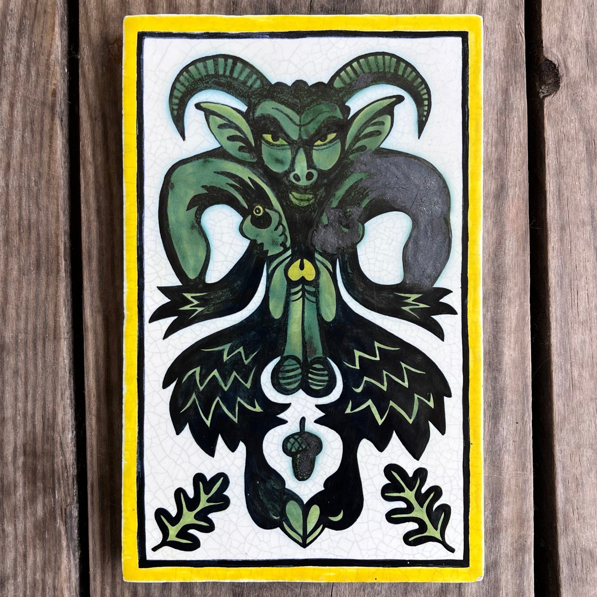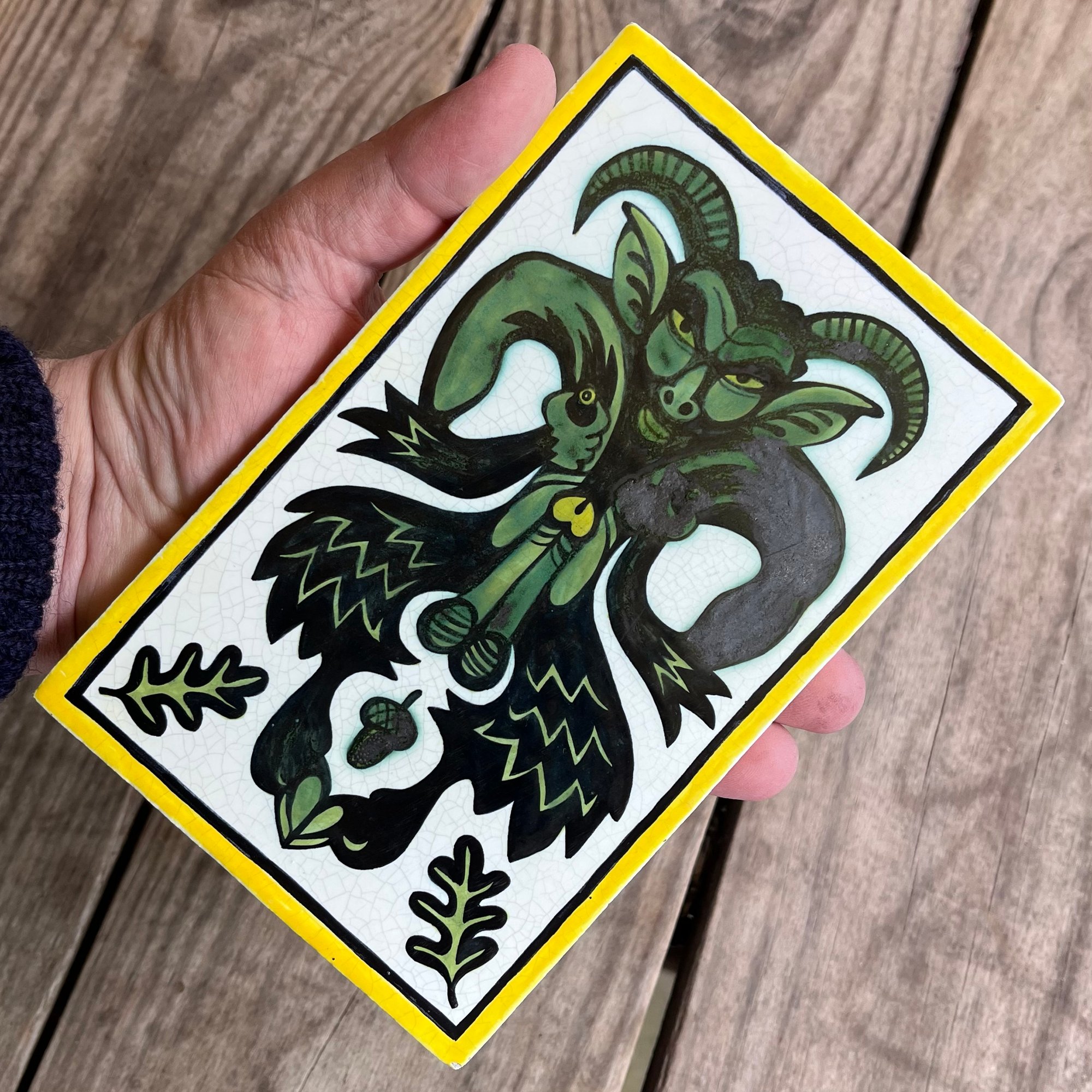 A stylised and aroused nipple-tweaking Faun in green. Hand-painted delft tile in Cobalt, Copper and Polychrome. Inspired by playing card designs and Black Forest wood carvings. Please note 'burn-out' from fluxing within the Copper, reflected in the price.
