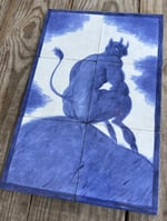 A six-tile stoneware tegeltableau (tile panel) with border showing a Faun or satyr sat upon a hummock. Hand-painted delft tiles in Cobalt, inspired by the work of Francisco Goya.