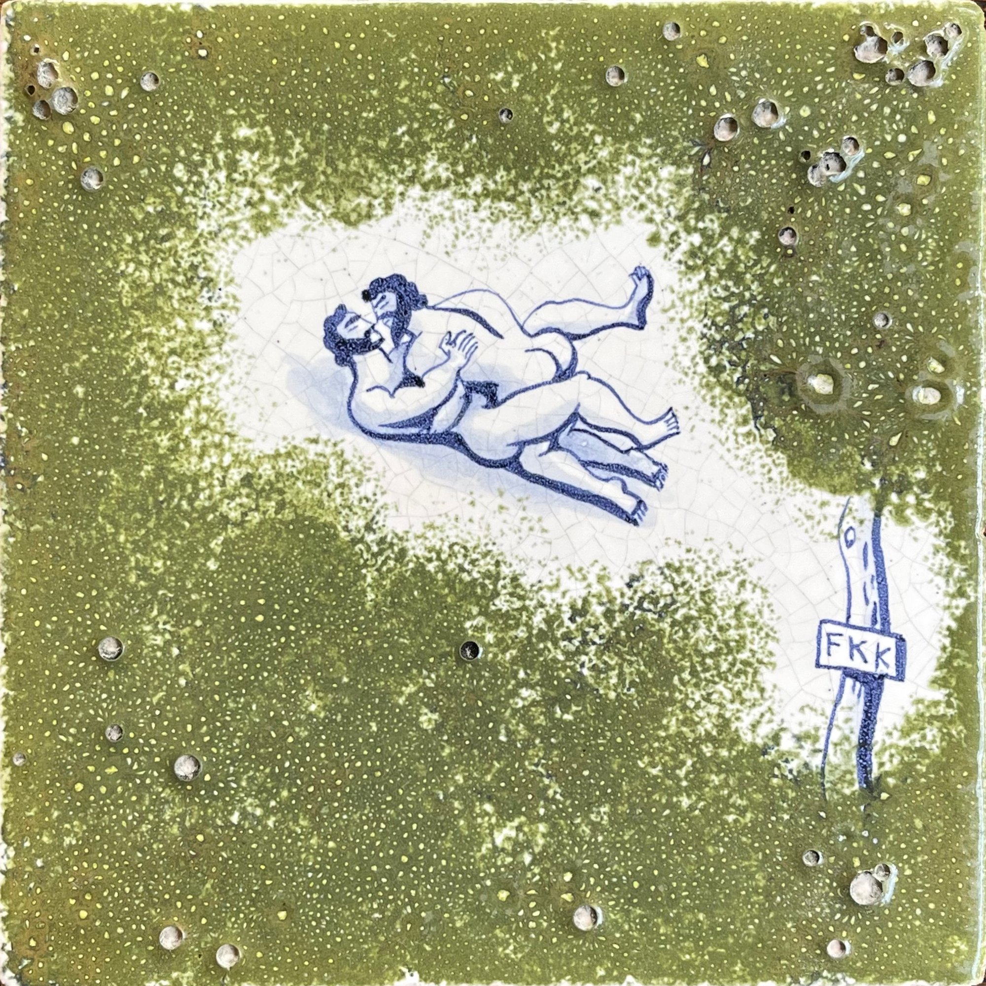 Two guys having fun in the FKK (Freikörperkultur) section of the wood. Hand-painted delft tile in Cobalt with oxhead corner motifs. Be advised This is a SECOND (reflected in the price) due to the excessive bubbling and blow out of the glaze - be careful of sharp edges.