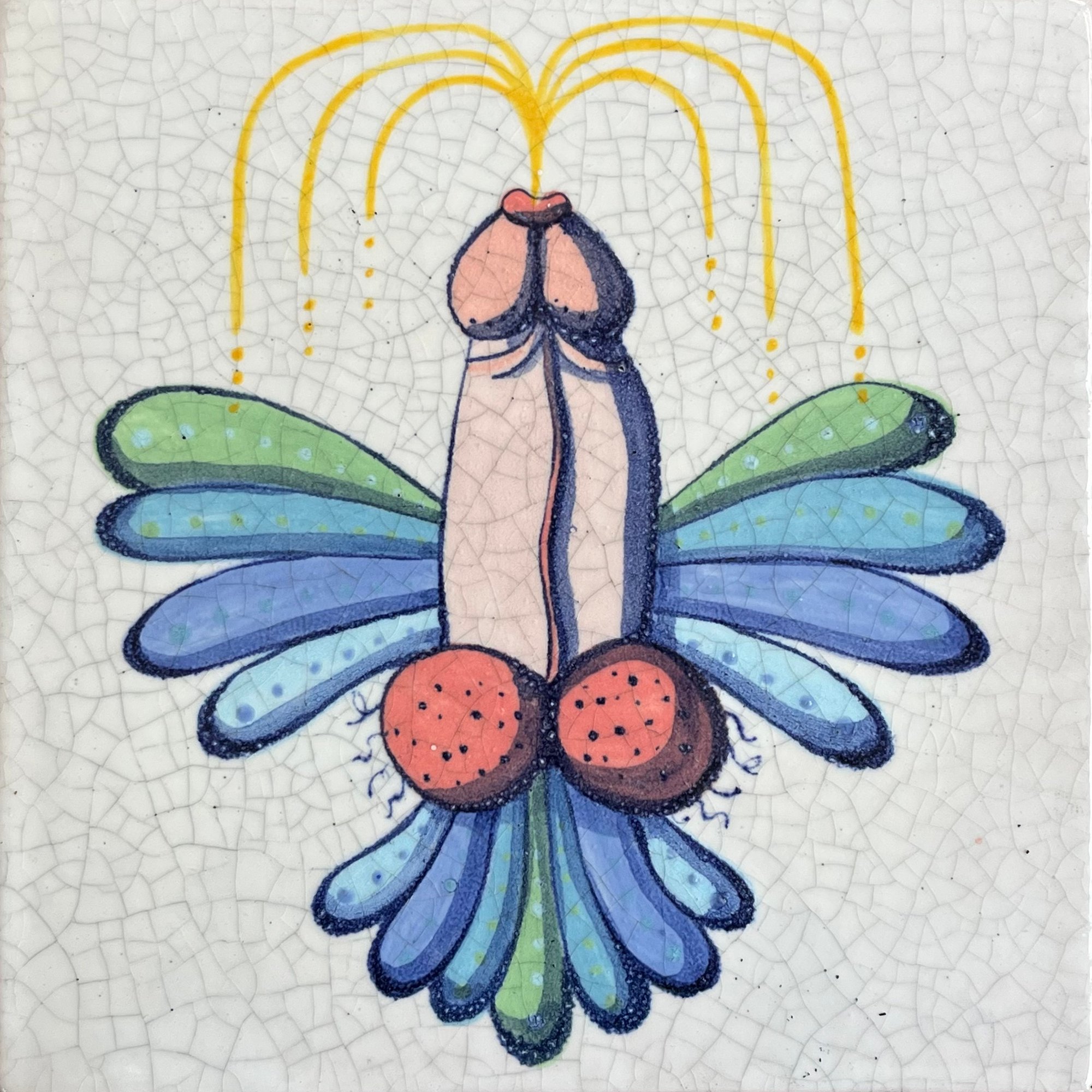 A feathered Phallus 'in erupzione'. Hand-painted delft tile in Cobalt and polychrome.