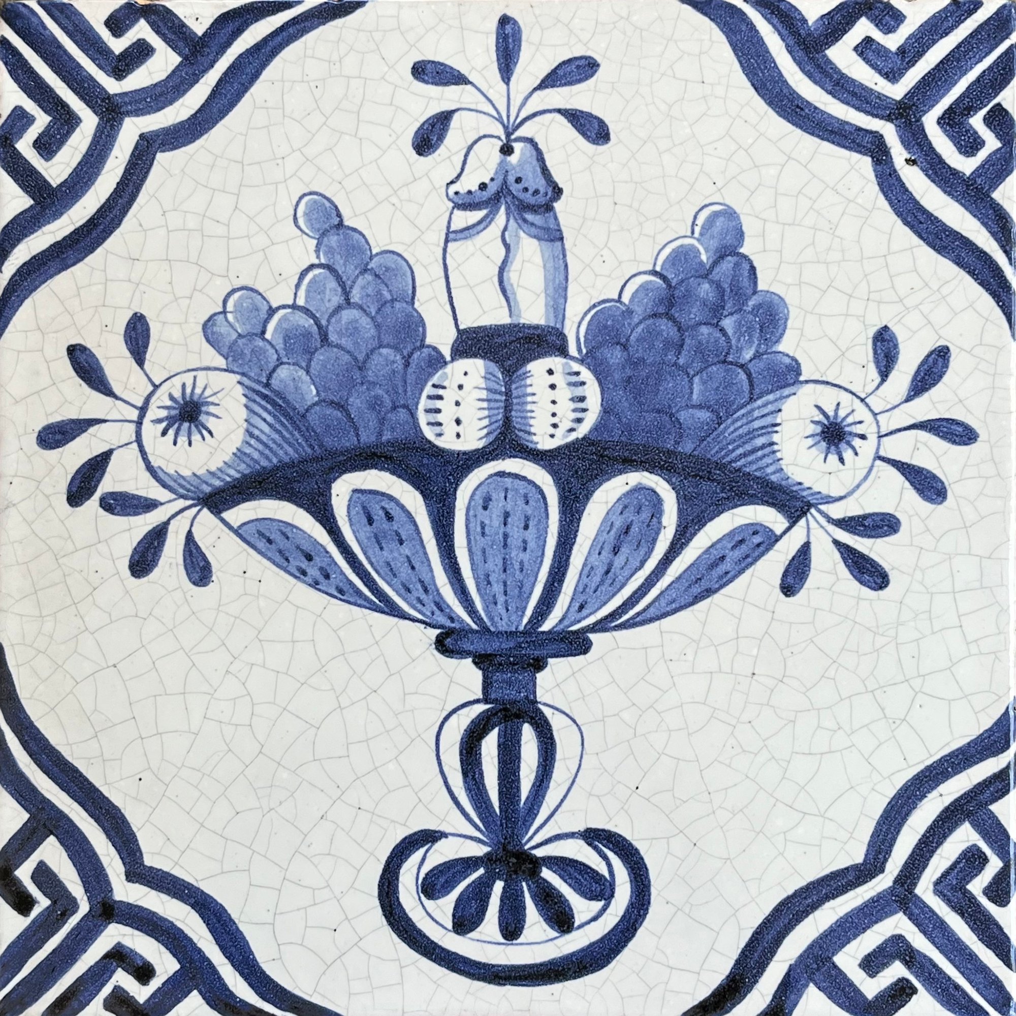 A very suggestive and fruity bowl of fruit. Hand-painted delft tile in Cobalt with wan-li corner motifs. Inspired by a traditional Dutch design.