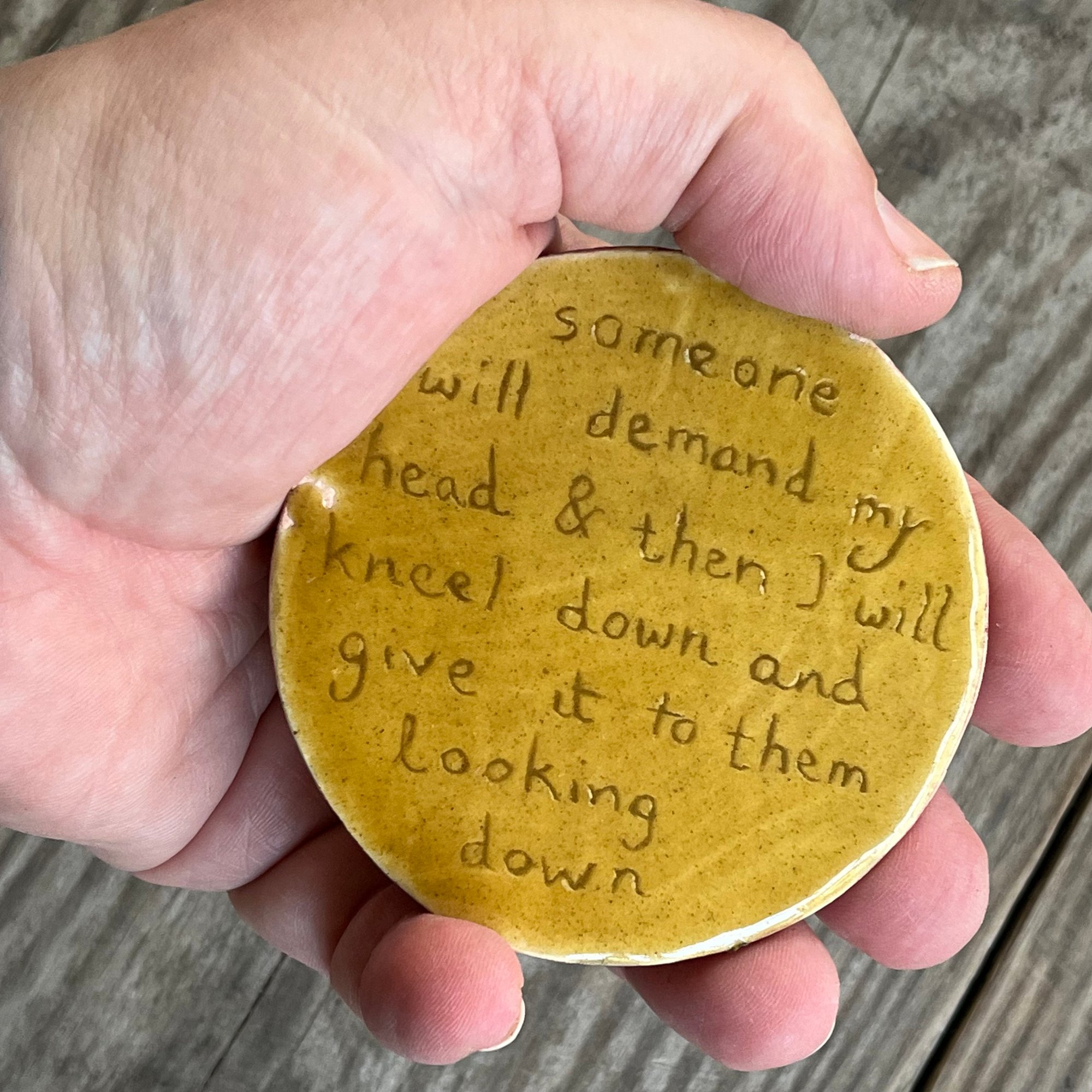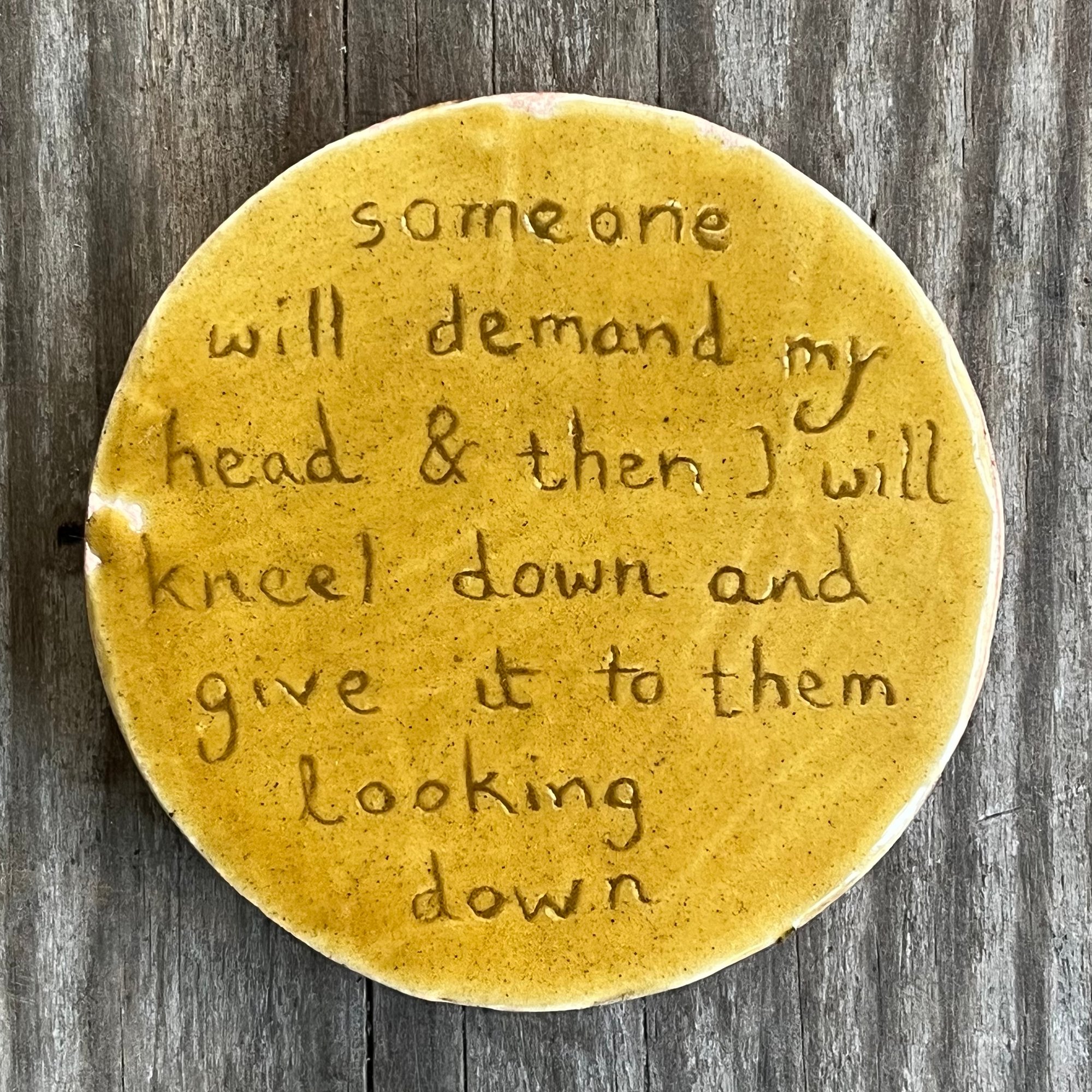 A terracotta honey-glazed slipware roundel with suggestive lyrics from Rufus Wainwright's song 'Gay Messiah'.