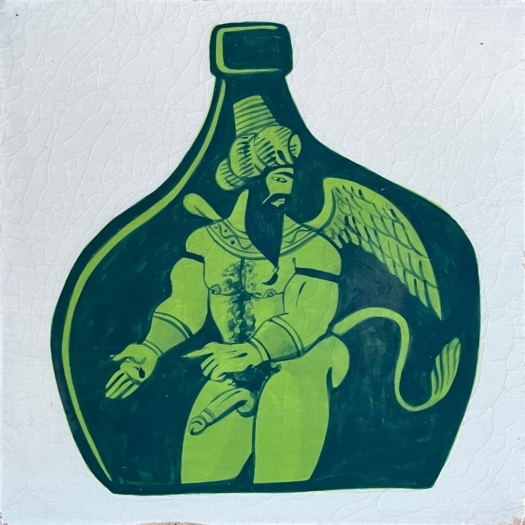 A Genie, or Djinn, in a Bottle. Hand-painted tile in Greens.