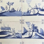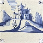 A naked man headstanding on the path before a church. Hand-painted delft tile in Cobalt with spider head corner motifs. One of four designs, inspired by a traditional Dutch design and a Northern Irish friend who does this.