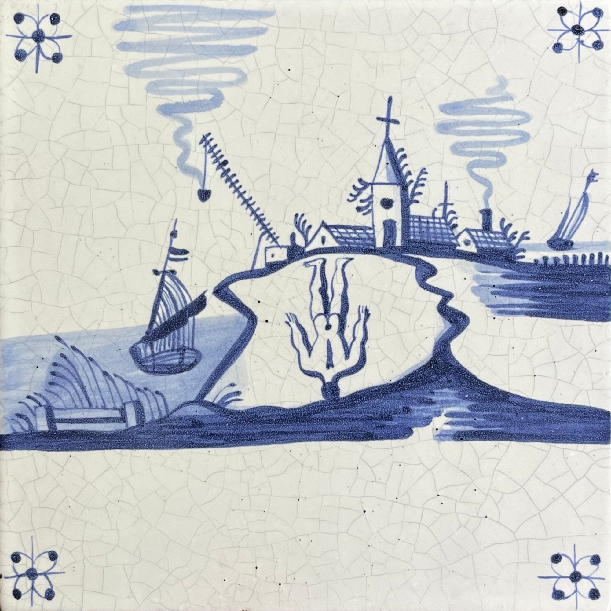 A naked man headstanding onshore beside a cargo-laden barge. Hand-painted delft tile in Cobalt with spider head corner motifs. One of four designs, inspired by a traditional Dutch design and a Northern Irish friend who does this.