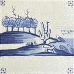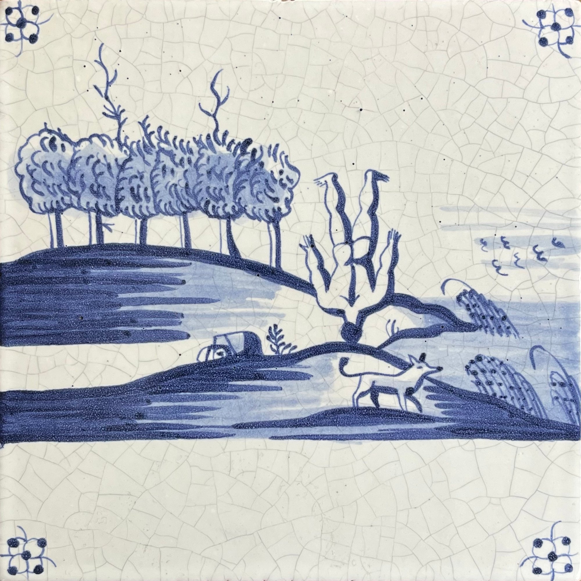 A naked man headstanding by the lakeside, his backpack and dog close by. Hand-painted delft tile in Cobalt with spider head corner motifs. One of four designs, inspired by a traditional Dutch design and a Northern Irish friend who does this.