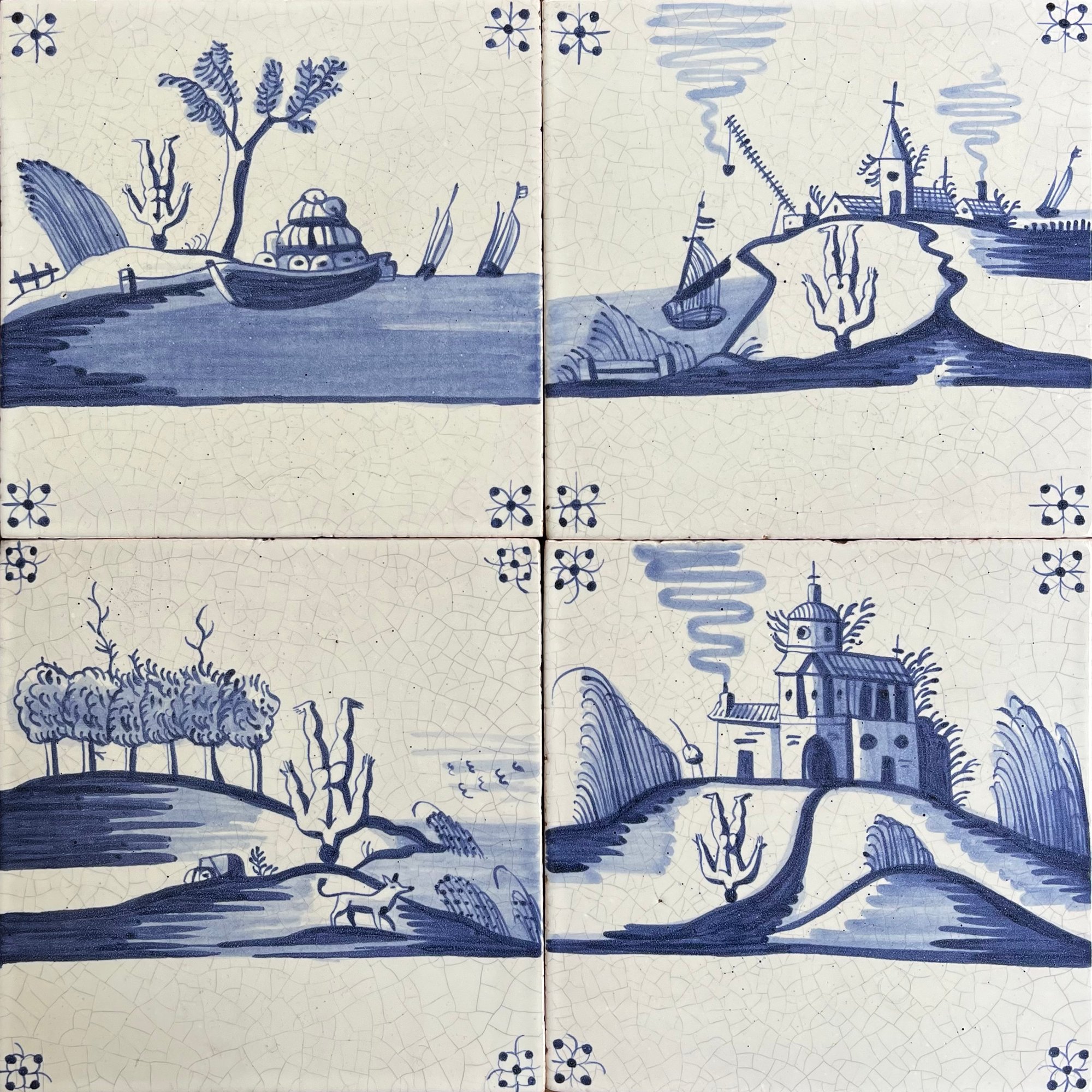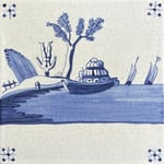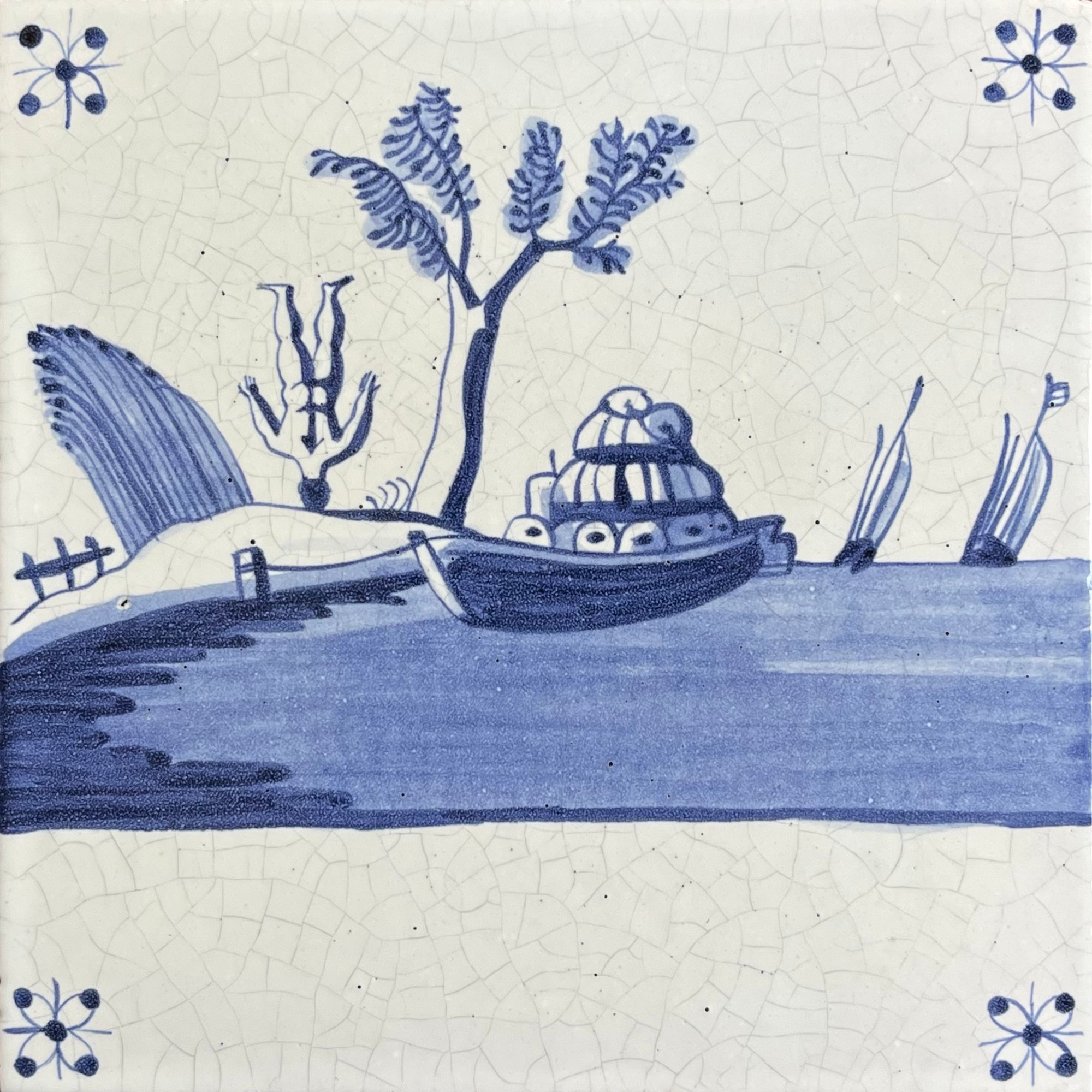 A naked man headstanding onshore beside a cargo-laden barge. Hand-painted delft tile in Cobalt with oxhead corner motifs. One of four designs, inspired by a traditional Dutch design and a Northern Irish friend who does this.