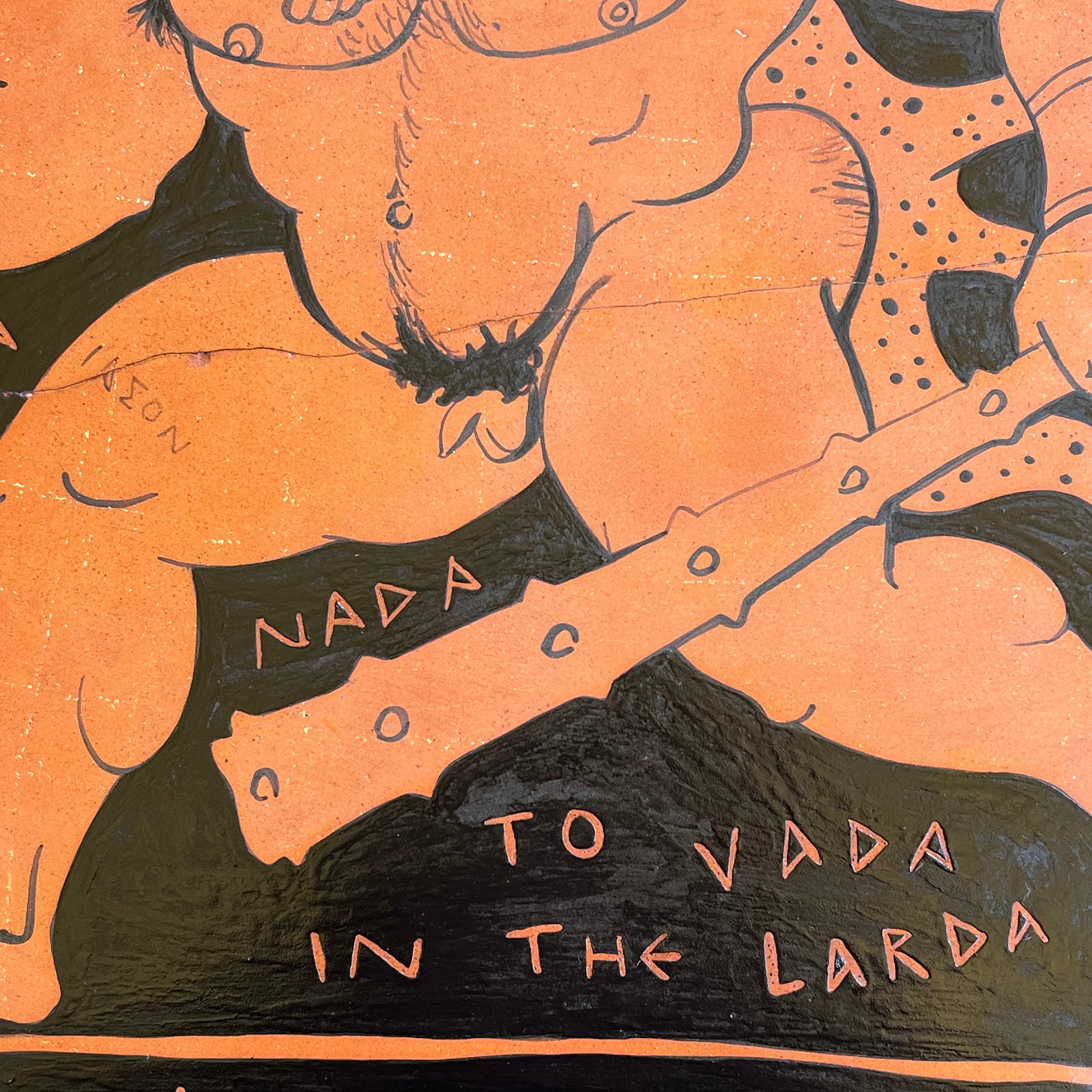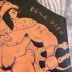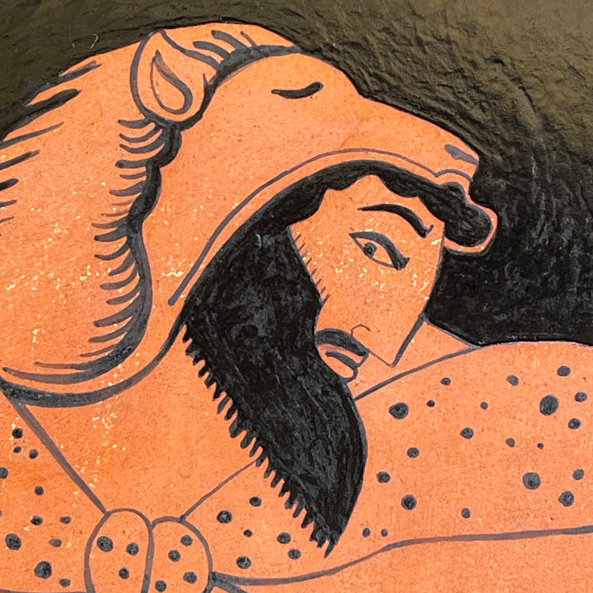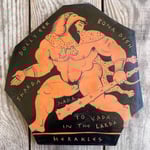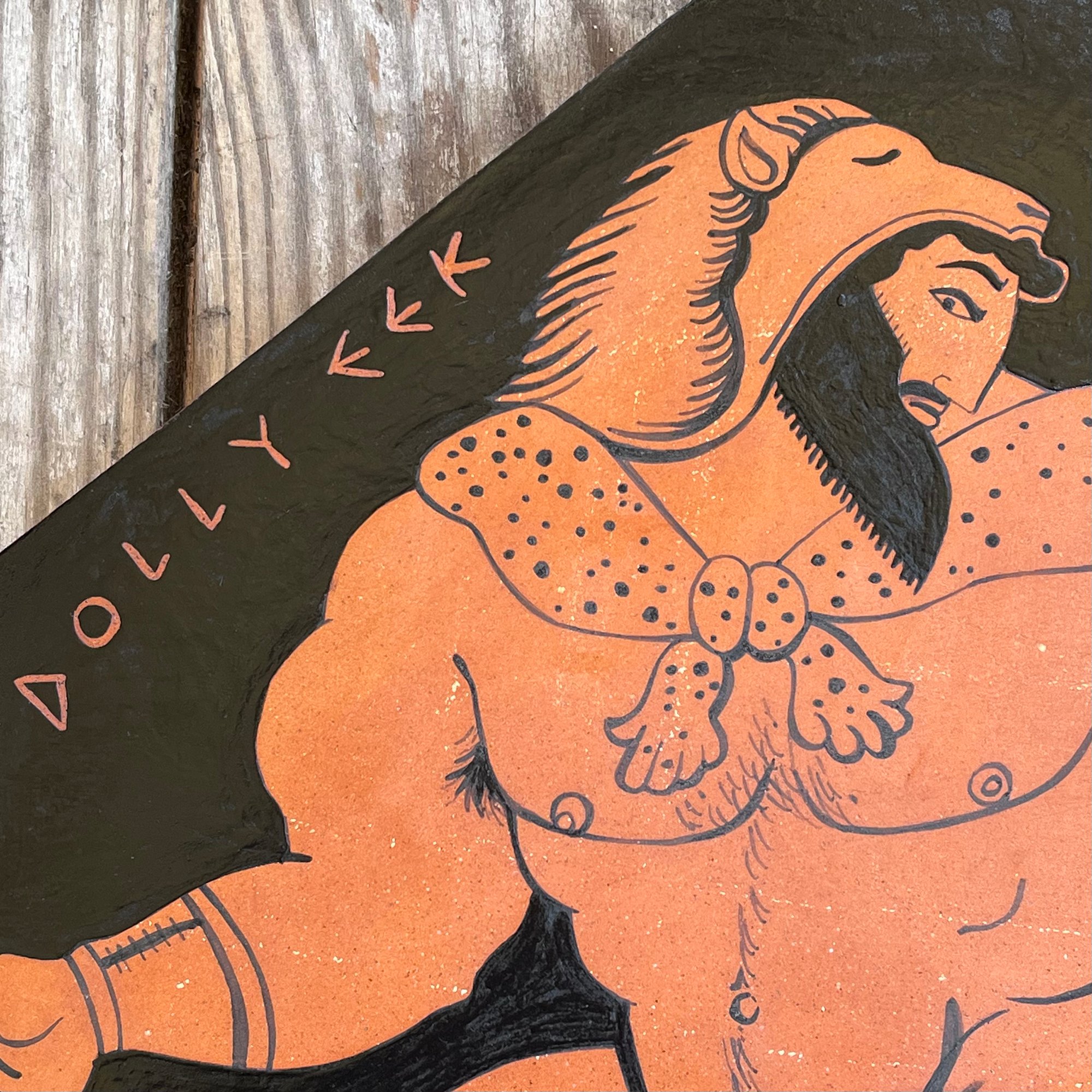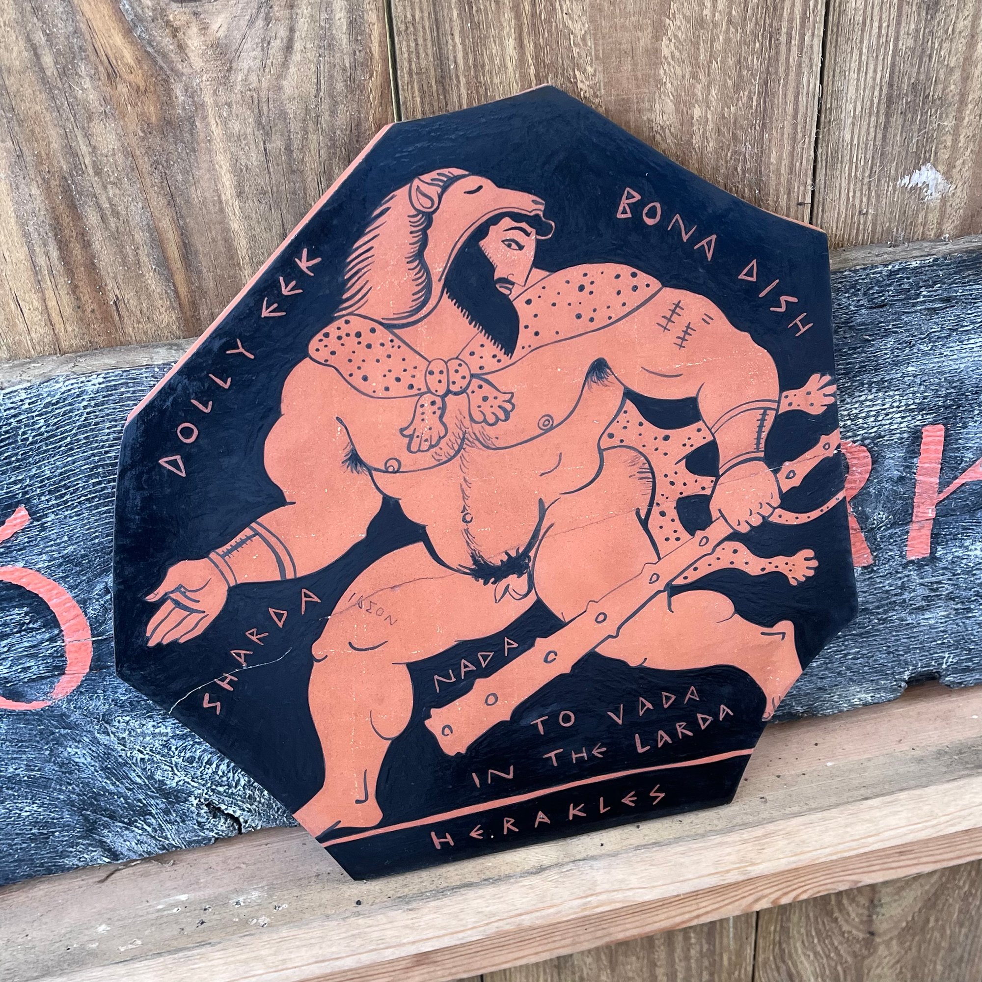 An Ancient Greek Red Figure-style ceramic plaque 'fragment' showing big bi demigod hero Herakles (Hercules) striding along with his trademark gnarled club and Nemean lion skin (and not much else). The words are written in Polari - a C19/20th British gay sociolect - Dolly Eek (pretty face) Bona Dish (great put) Sharda (there's) Nada in the Larda (Shame there's not much to see downstairs! - a common observation with Ancient Greek pottery and sculpture).Black glaze on red terracotta clay. Comes with a small metal D-ring on the back for hanging.