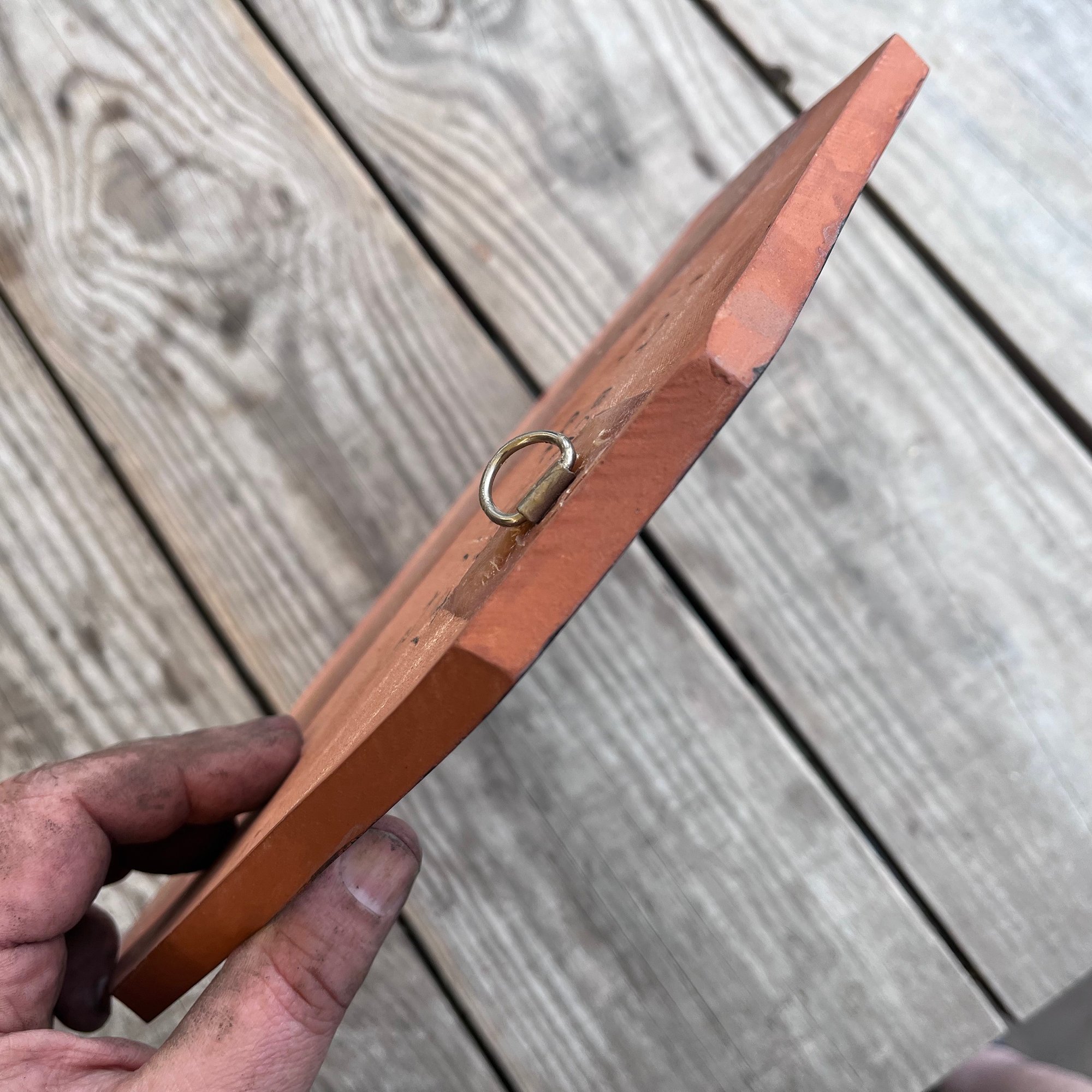 Note: the piece cracked in two during glaze firing but is now secured back in place using high strength ceramic glue and fibreglass. The crack, visible across his thighs, adds to the charm and authenticity of the plaque.
