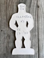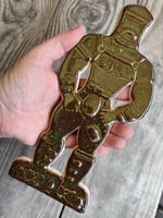 A glazed and moulded ceramic 'gingerbread' figure of a Leather Daddy in jockstrap, harness, muir cap and biker boots on white/ buff clay. Inspired by old Dutch gingerbread (speculaas) designs. Comes with a small metal hoop at the top for hanging.