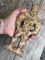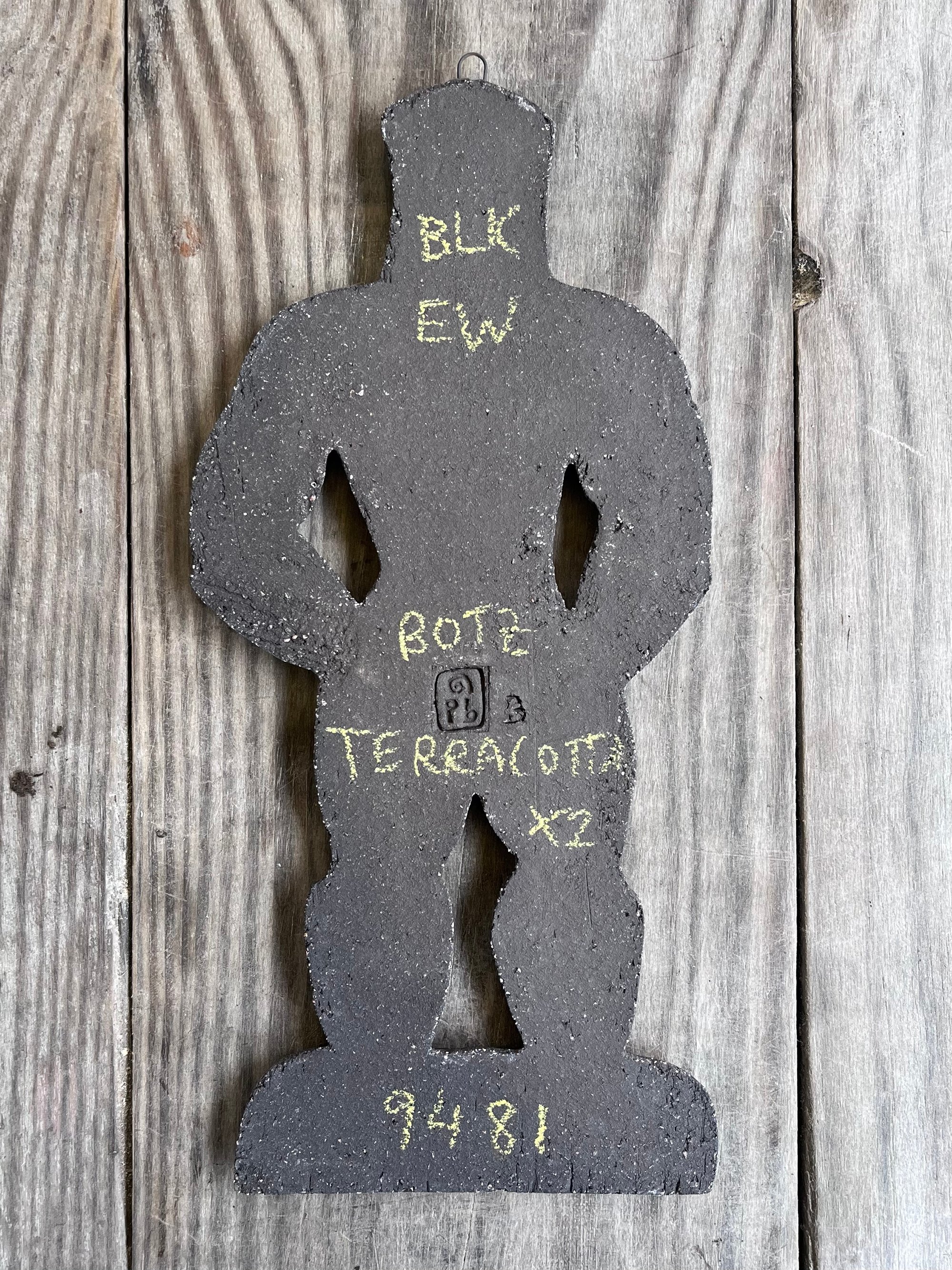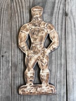 A glazed and moulded ceramic 'gingerbread' figure of a Leather Daddy in jockstrap, harness, muir cap and biker boots on black clay. Inspired by old Dutch gingerbread (speculaas) designs. Comes with a small metal hoop at the top for hanging.