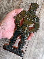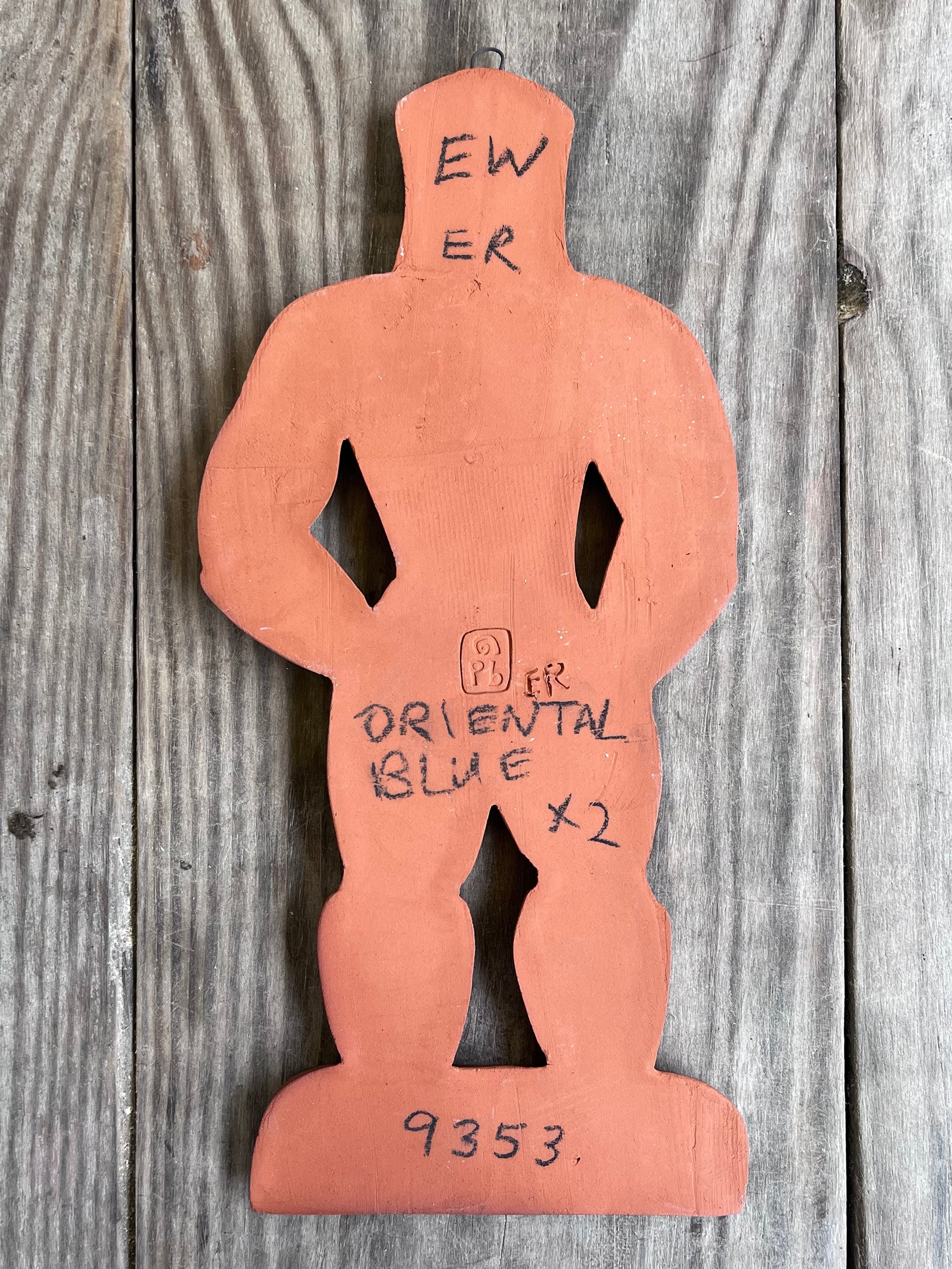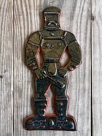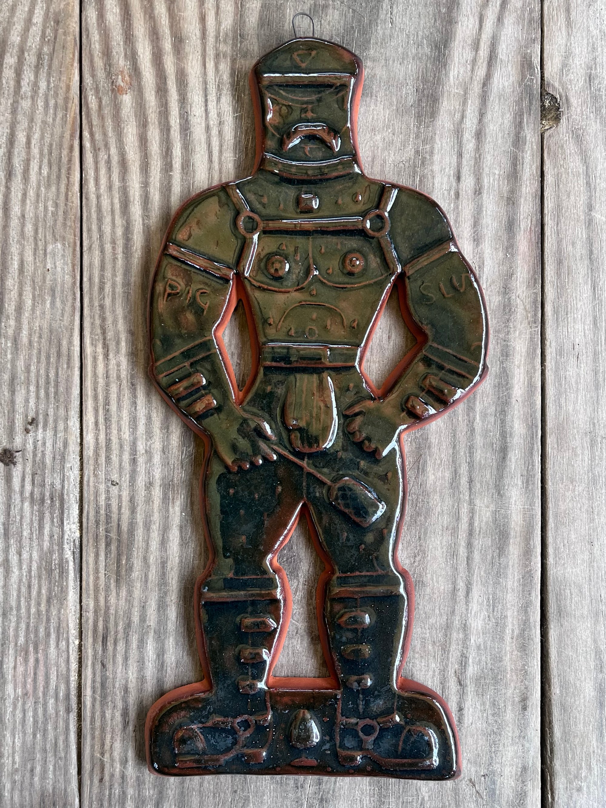 A glazed and moulded ceramic 'gingerbread' figure of a Leather Daddy in jockstrap, harness, muir cap and biker boots on terracotta. Inspired by old Dutch gingerbread (speculaas) designs. Comes with a small metal hoop at the top for hanging.