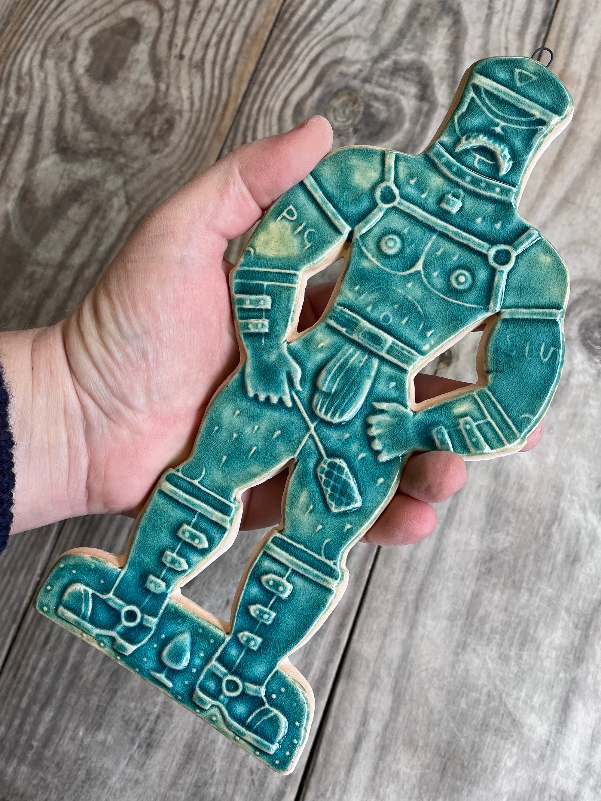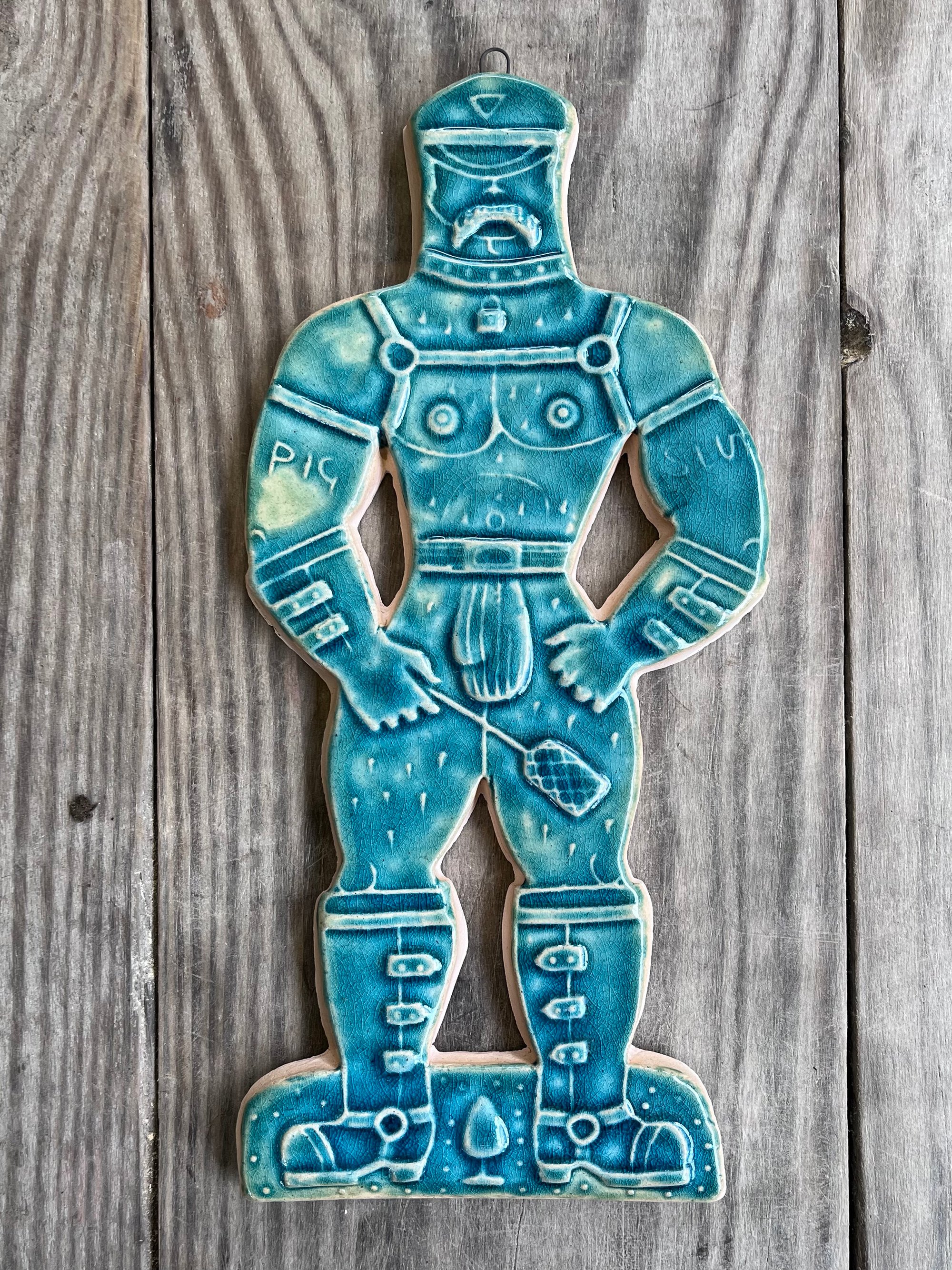 A glazed and moulded ceramic 'gingerbread' figure of a Leather Daddy in jockstrap, harness, muir cap and biker boots on white/ buff clay. Inspired by old Dutch gingerbread (speculaas) designs. Comes with a small metal hoop at the top for hanging.