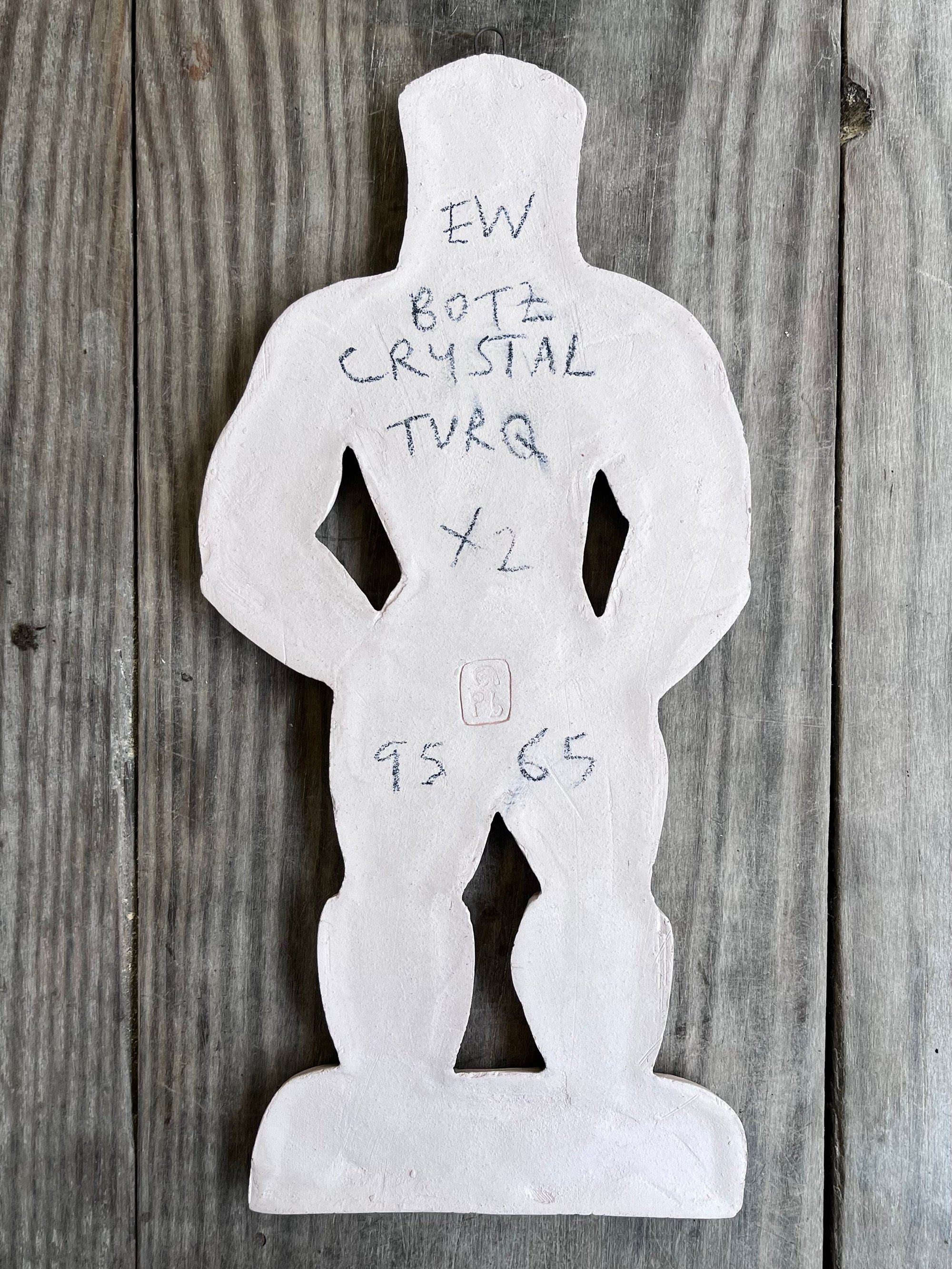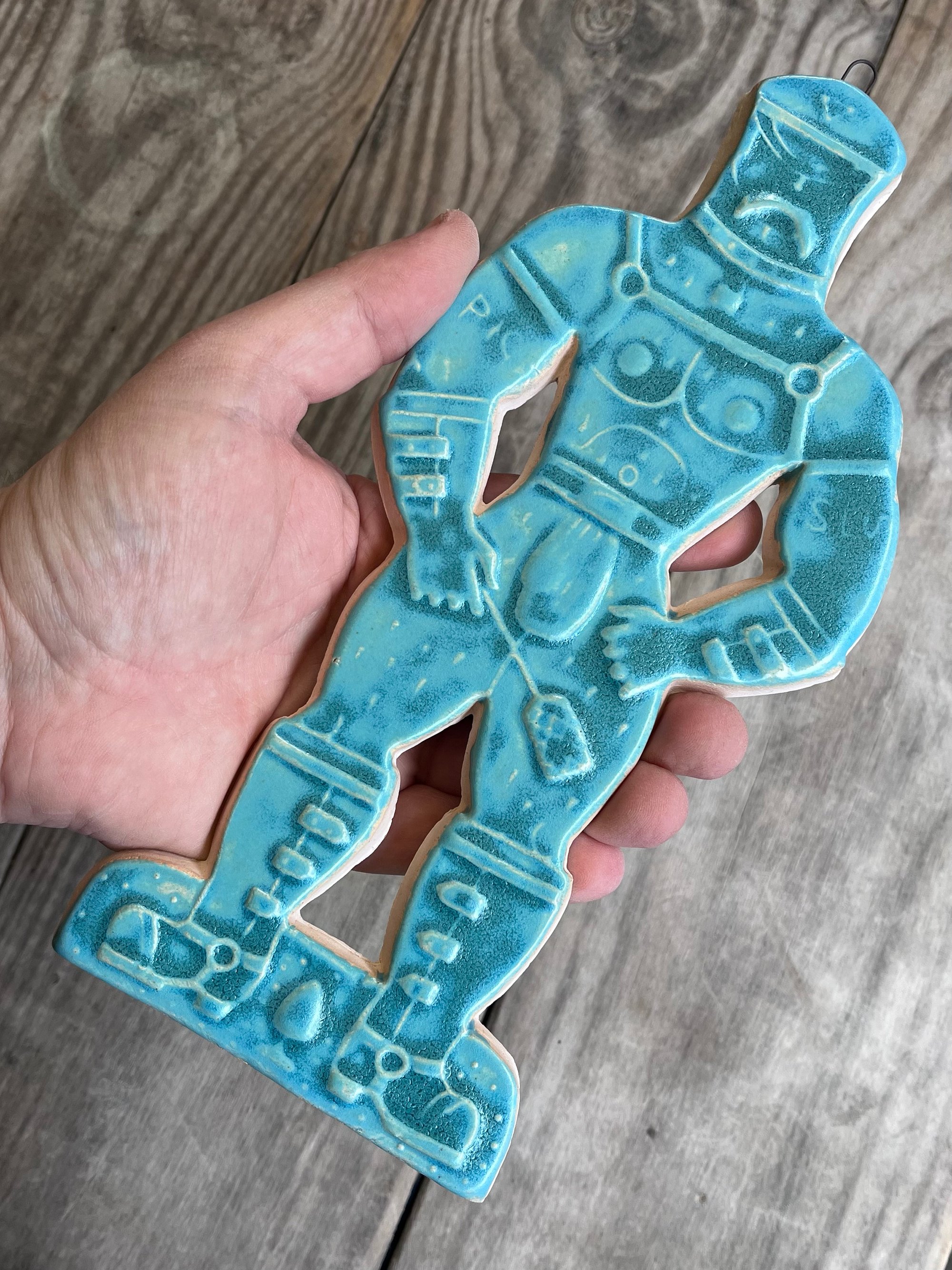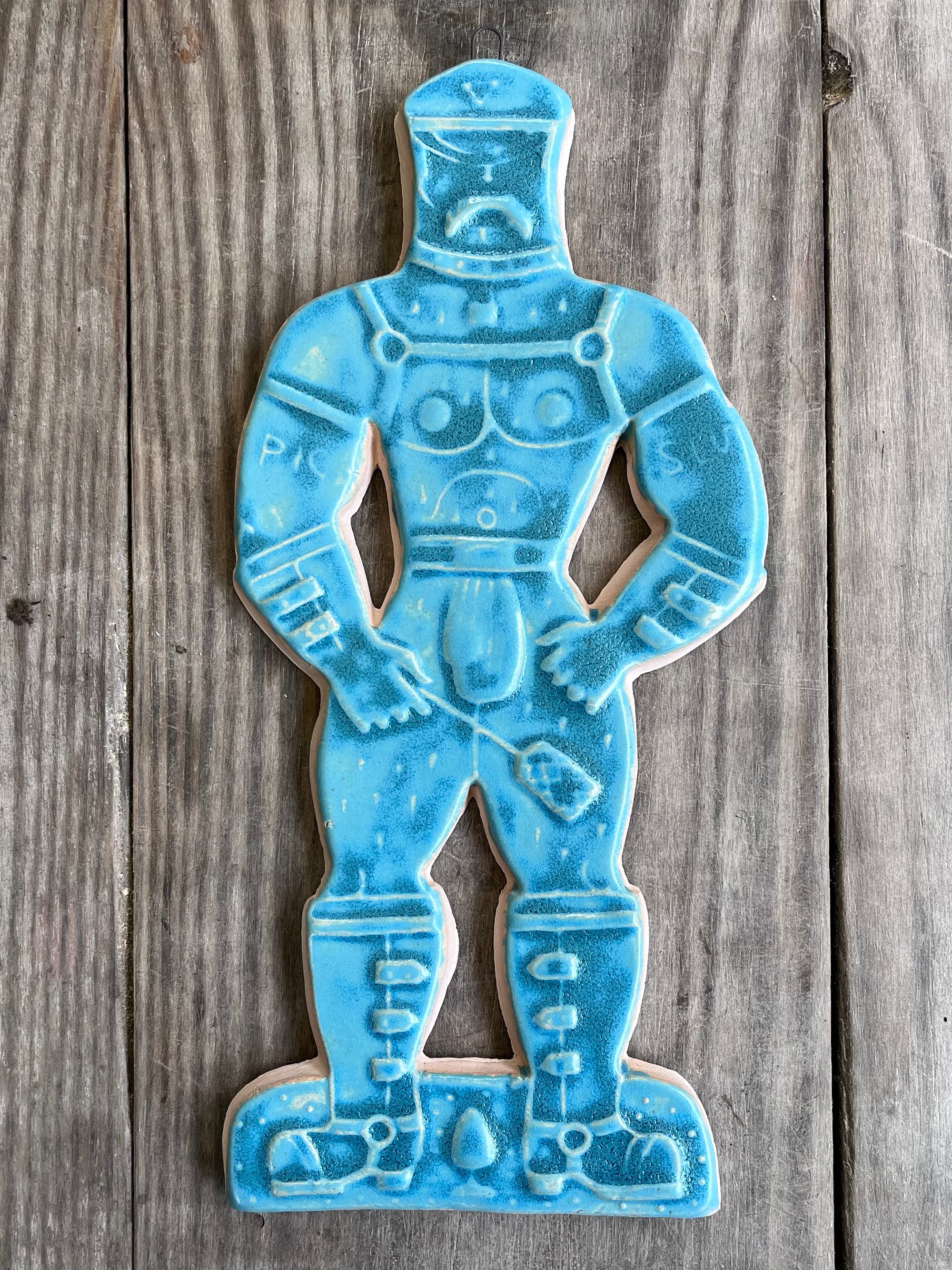 A glazed and moulded ceramic 'gingerbread' figure of a Leather Daddy in jockstrap, harness, muir cap and biker boots on white/ buff clay. Inspired by old Dutch gingerbread (speculaas) designs. Comes with a small metal hoop at the top for hanging.