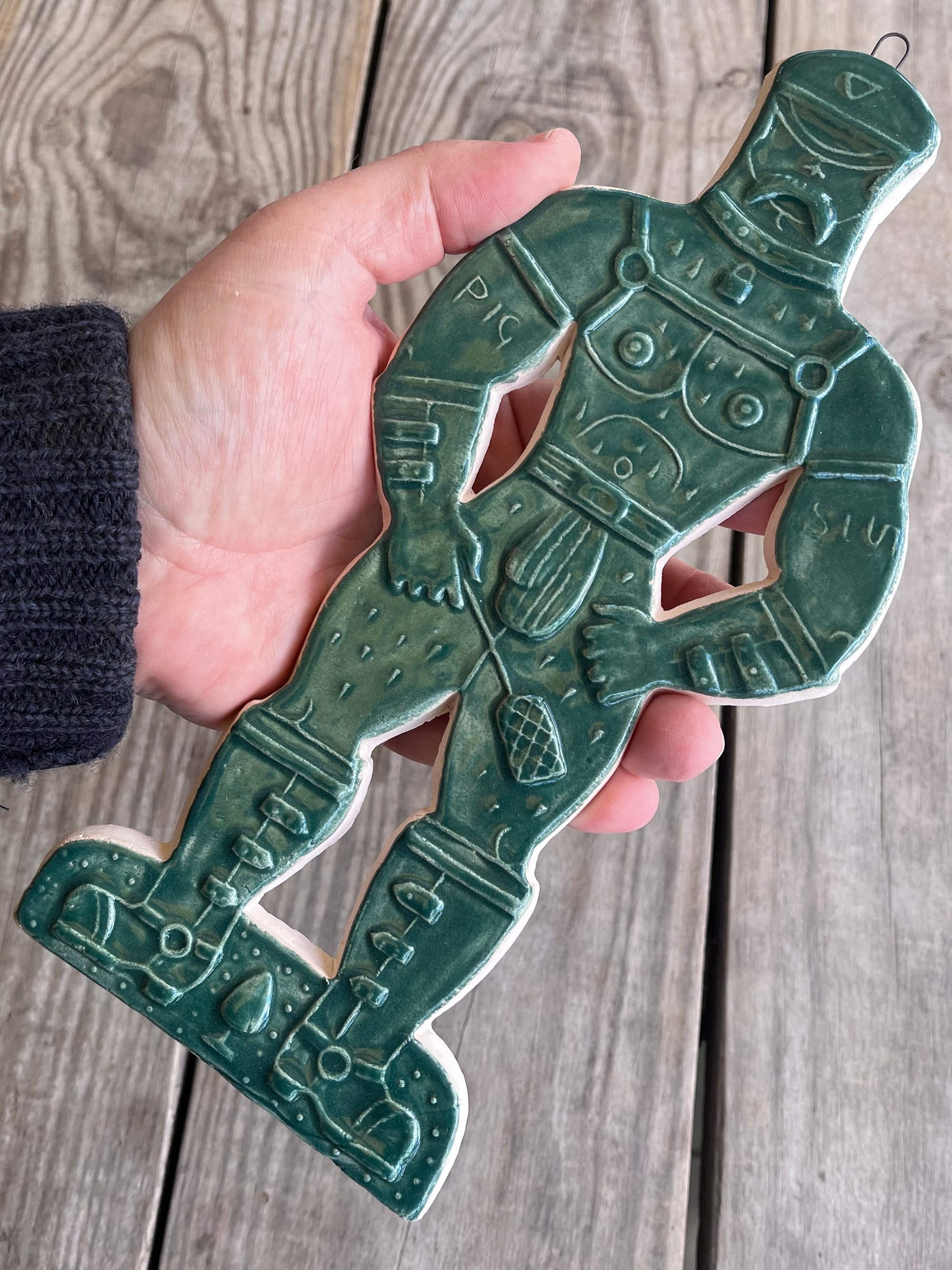 A glazed and moulded ceramic 'gingerbread' figure of a Leather Daddy in jockstrap, harness, muir cap and biker boots on white/ buff clay. Inspired by old Dutch gingerbread (speculaas) designs. Comes with a small metal hoop at the top for hanging.