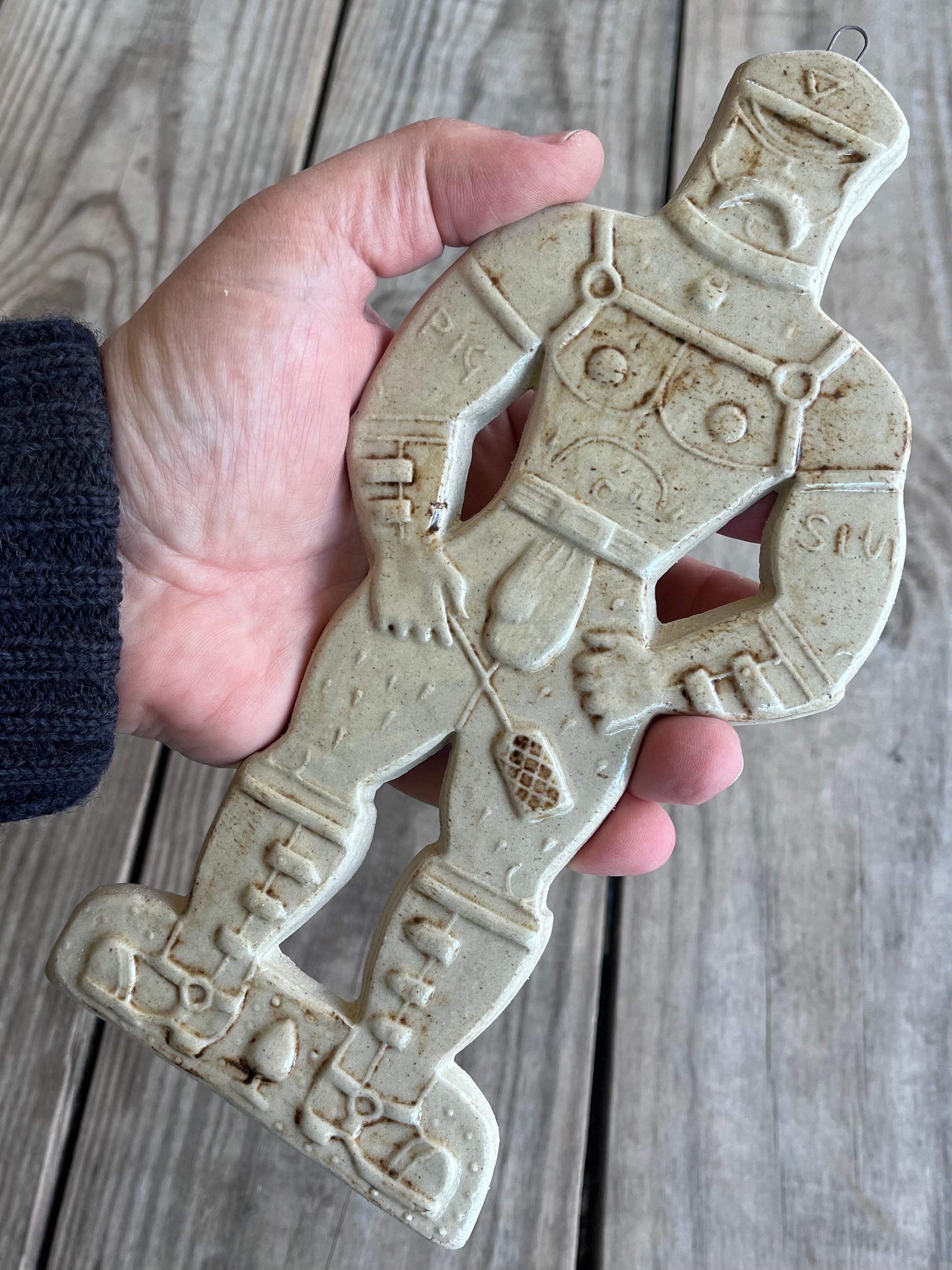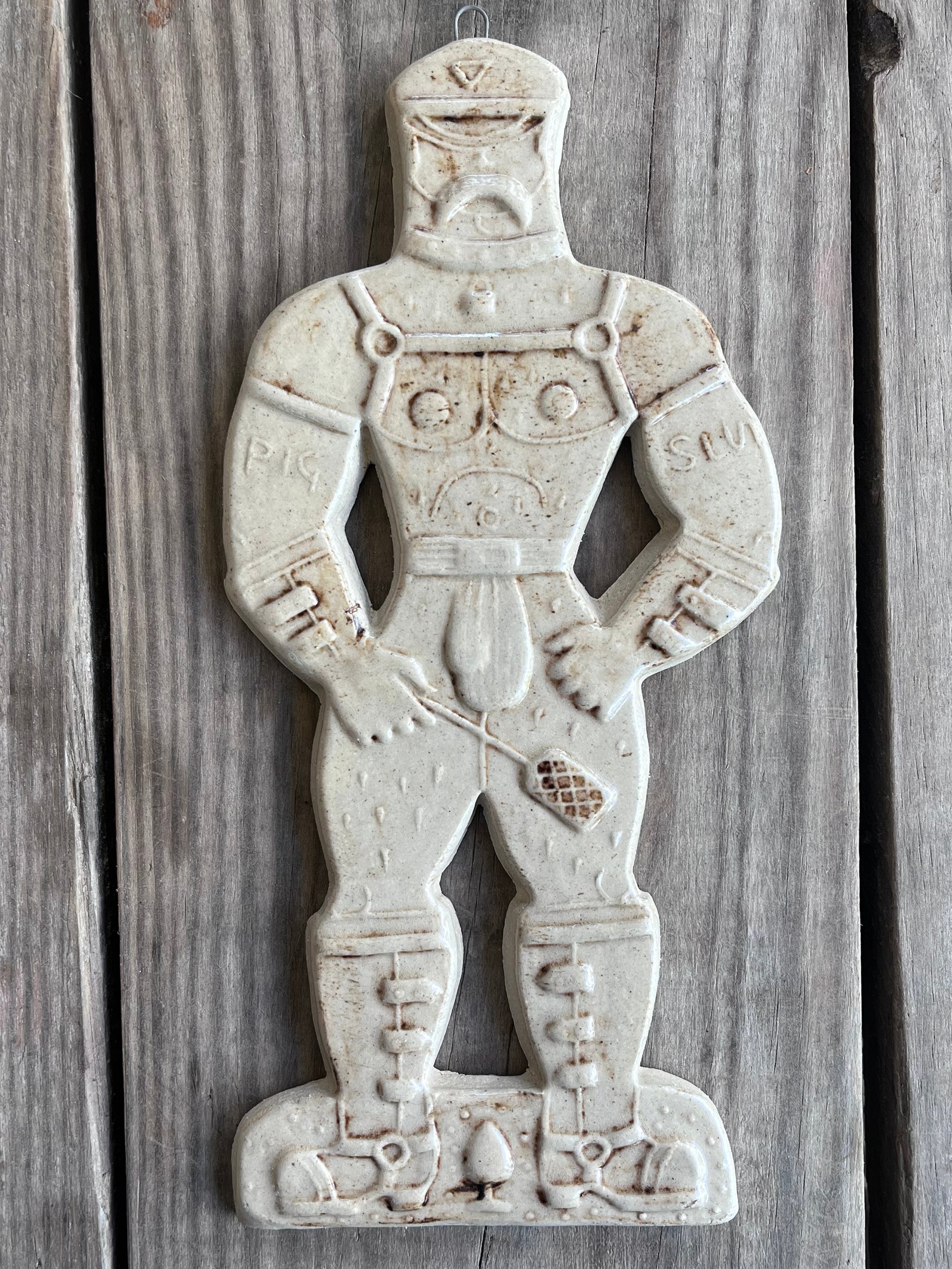 A glazed and moulded ceramic 'gingerbread' figure of a Leather Daddy in jockstrap, harness, muir cap and biker boots on white/ buff clay. Inspired by old Dutch gingerbread (speculaas) designs. Comes with a small metal hoop at the top for hanging.