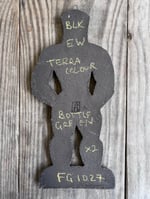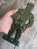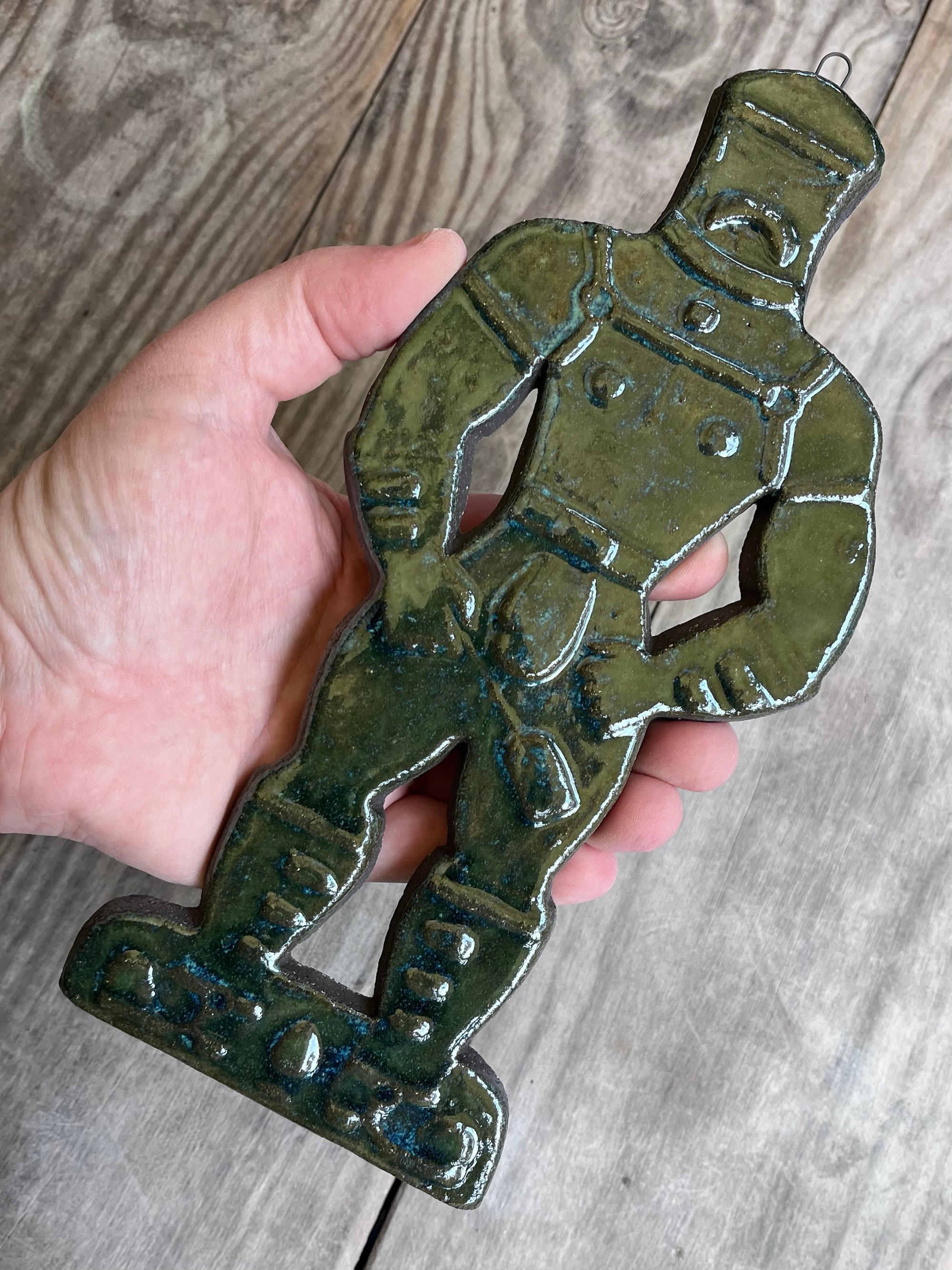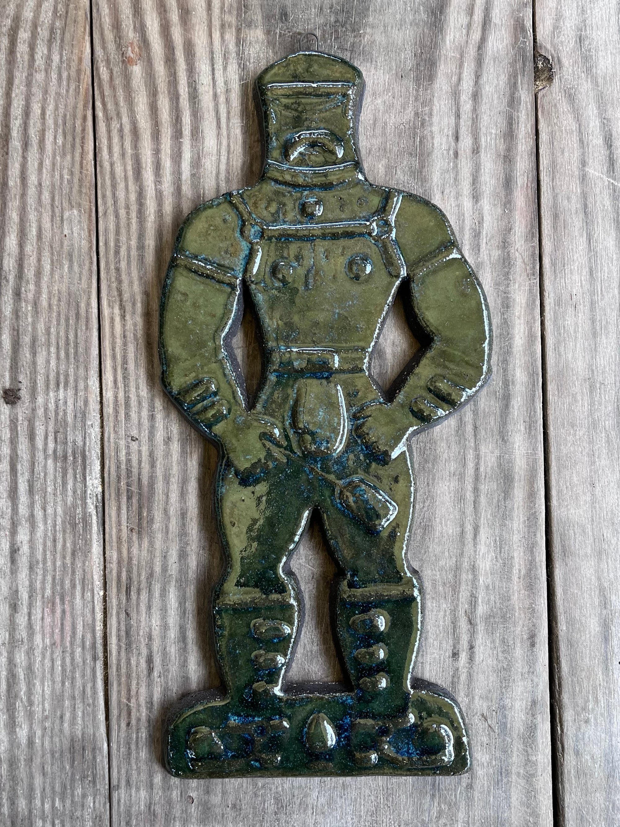 A glazed and moulded ceramic 'gingerbread' figure of a Leather Daddy in jockstrap, harness, muir cap and biker boots on black clay. Inspired by old Dutch gingerbread (speculaas) designs. Comes with a small metal hoop at the top for hanging.