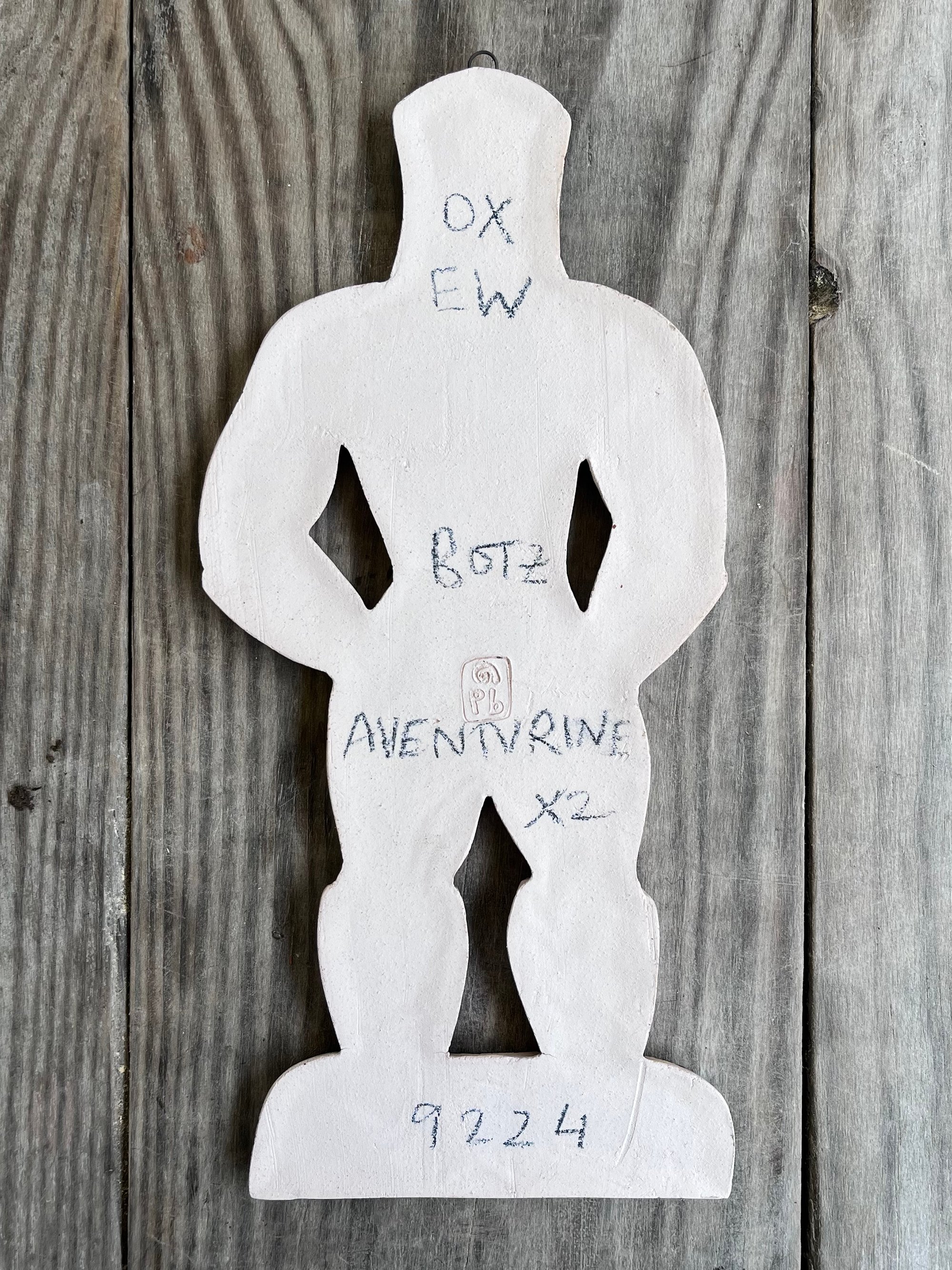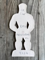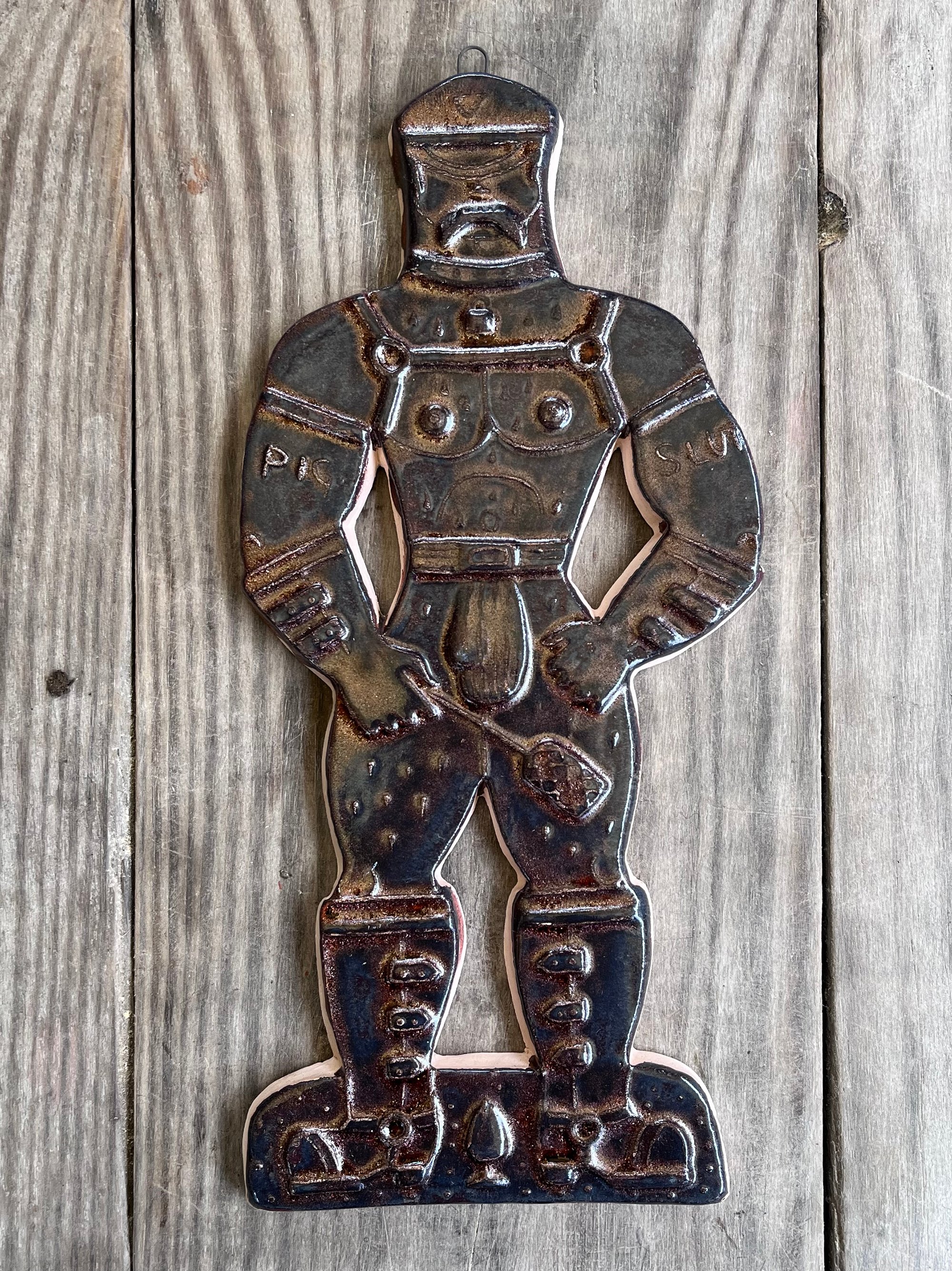 A glazed and moulded ceramic 'gingerbread' figure of a Leather Daddy in jockstrap, harness, muir cap and biker boots on white/ buff clay. Inspired by old Dutch gingerbread (speculaas) designs. Comes with a small metal hoop at the top for hanging.