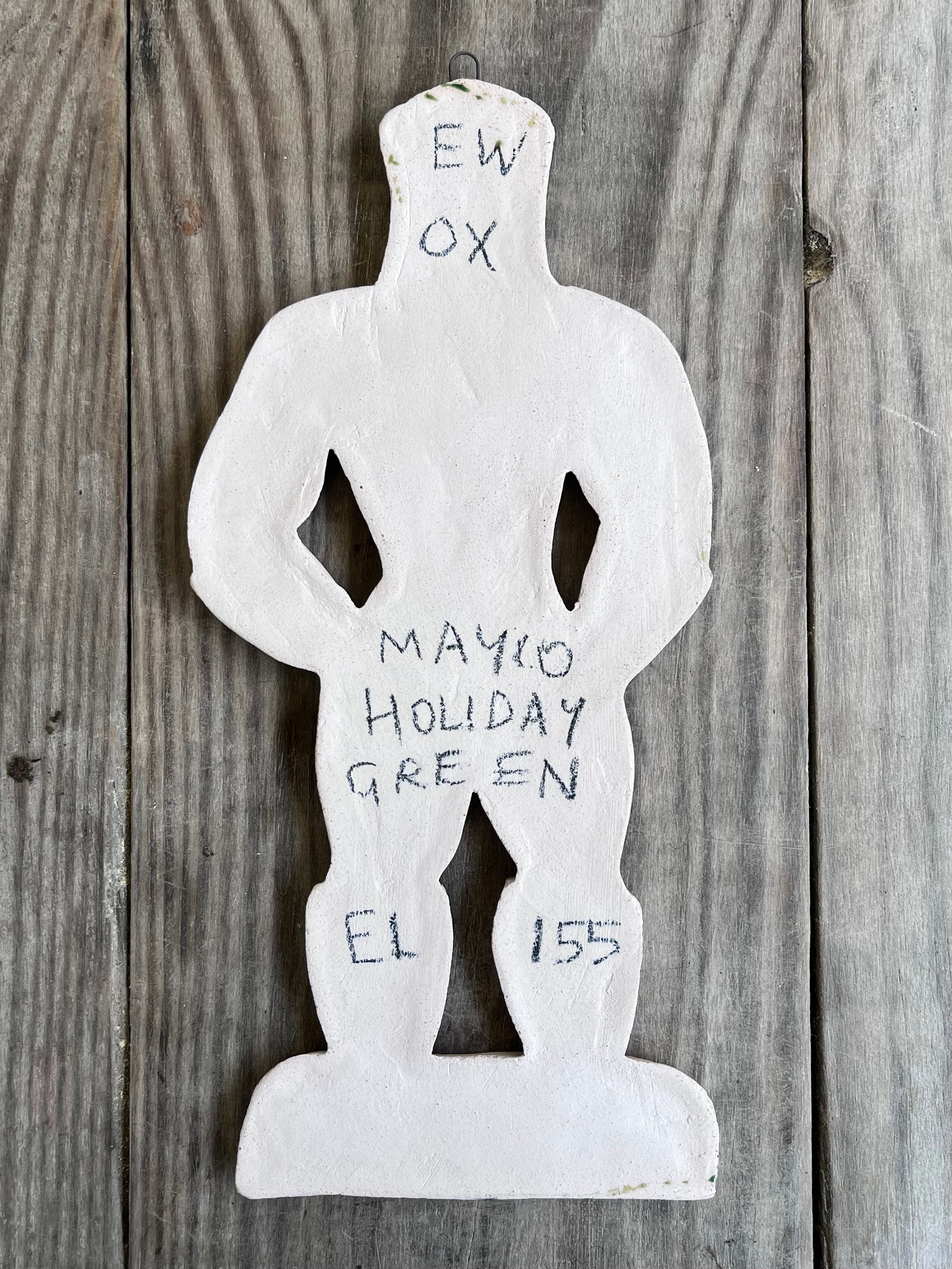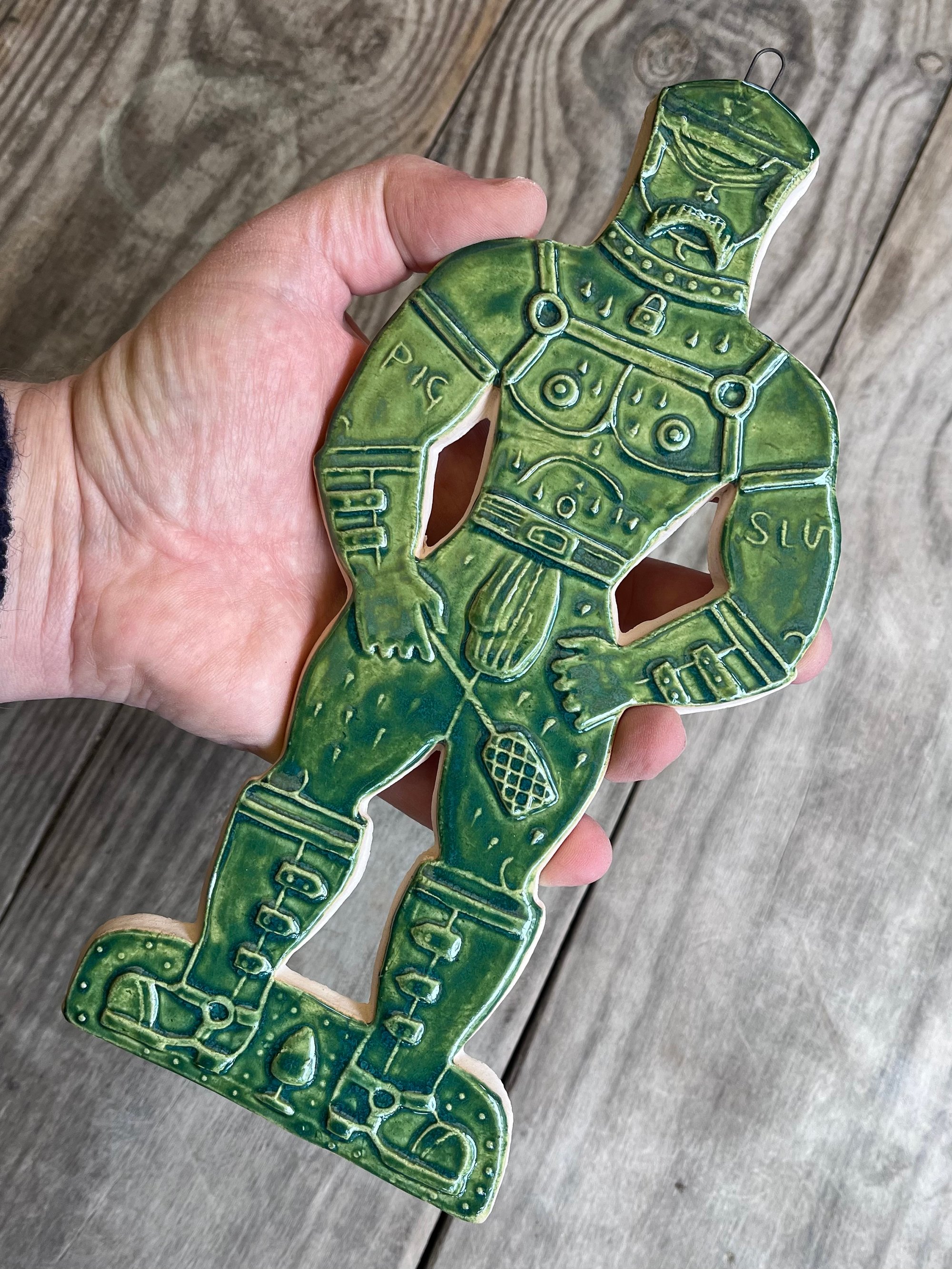 A glazed and moulded ceramic 'gingerbread' figure of a Leather Daddy in jockstrap, harness, muir cap and biker boots on white/ buff clay. Inspired by old Dutch gingerbread (speculaas) designs. Comes with a small metal hoop at the top for hanging.