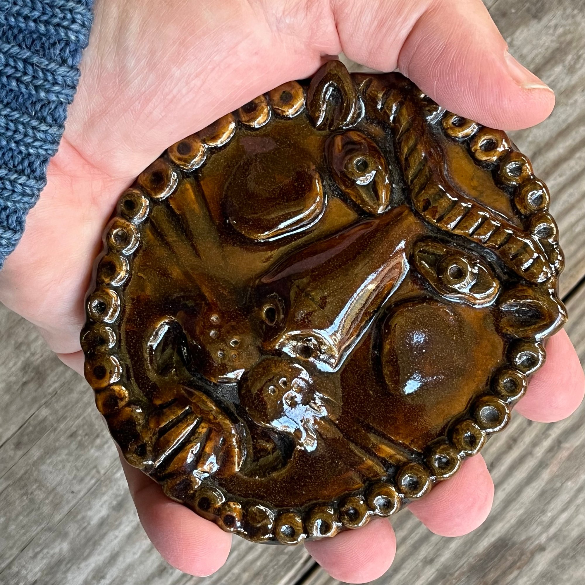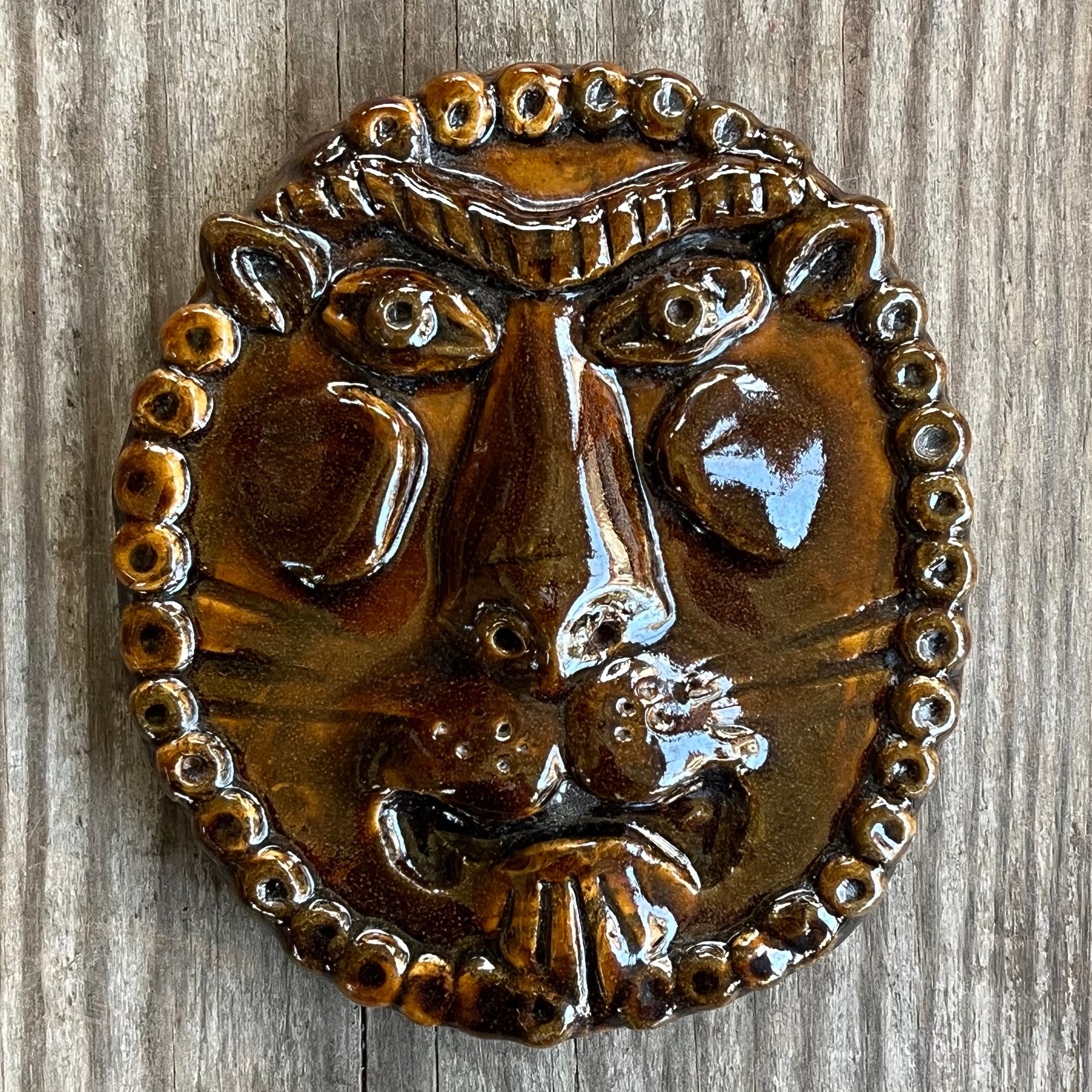 A sculpted roaring Lion's face, glazed in treacle brown. Inspired by medieval pottery.