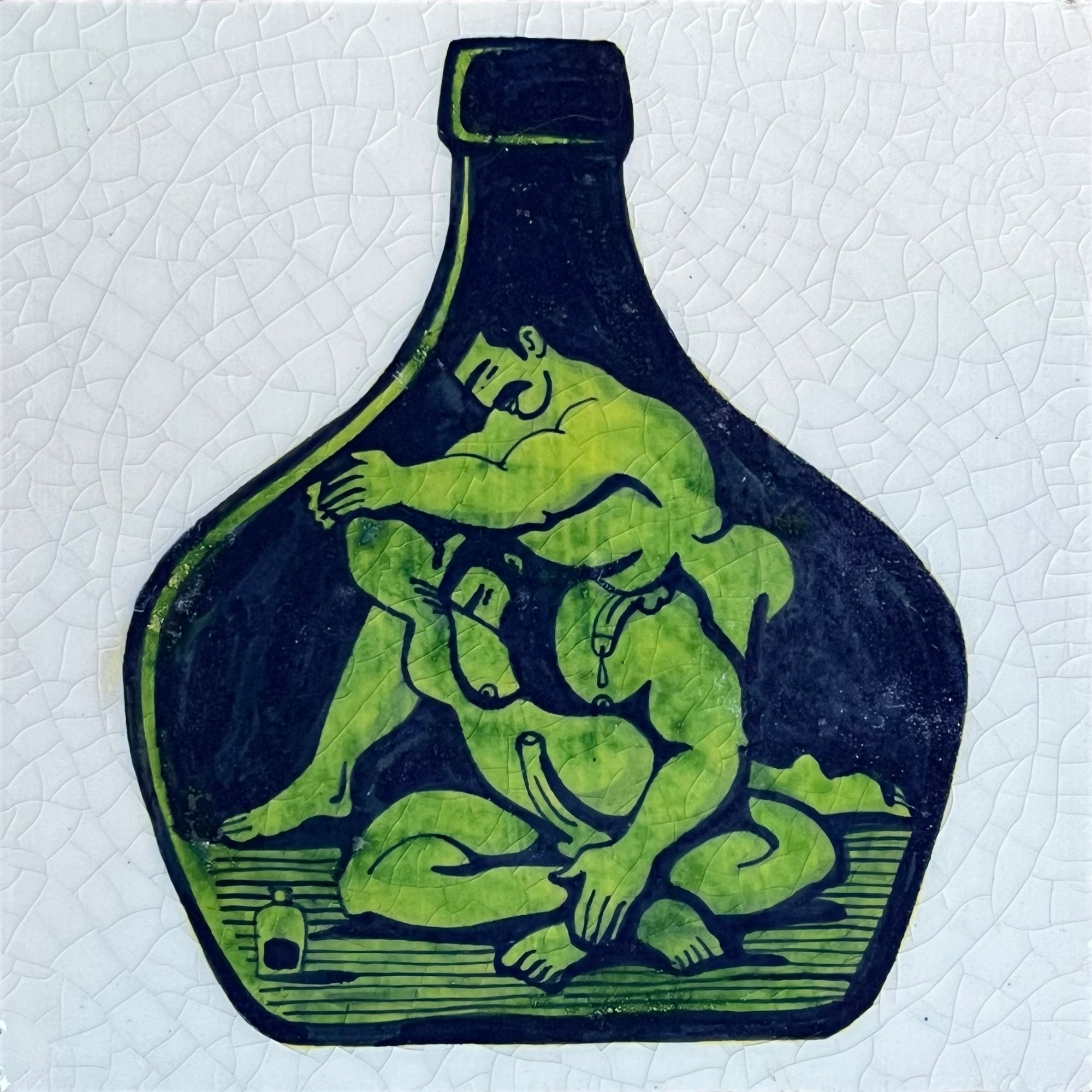 Massage in a Bottle: the joy of sensual consensual touch distilled. Hand-painted tile in Cobalt, Copper and Polychrome.