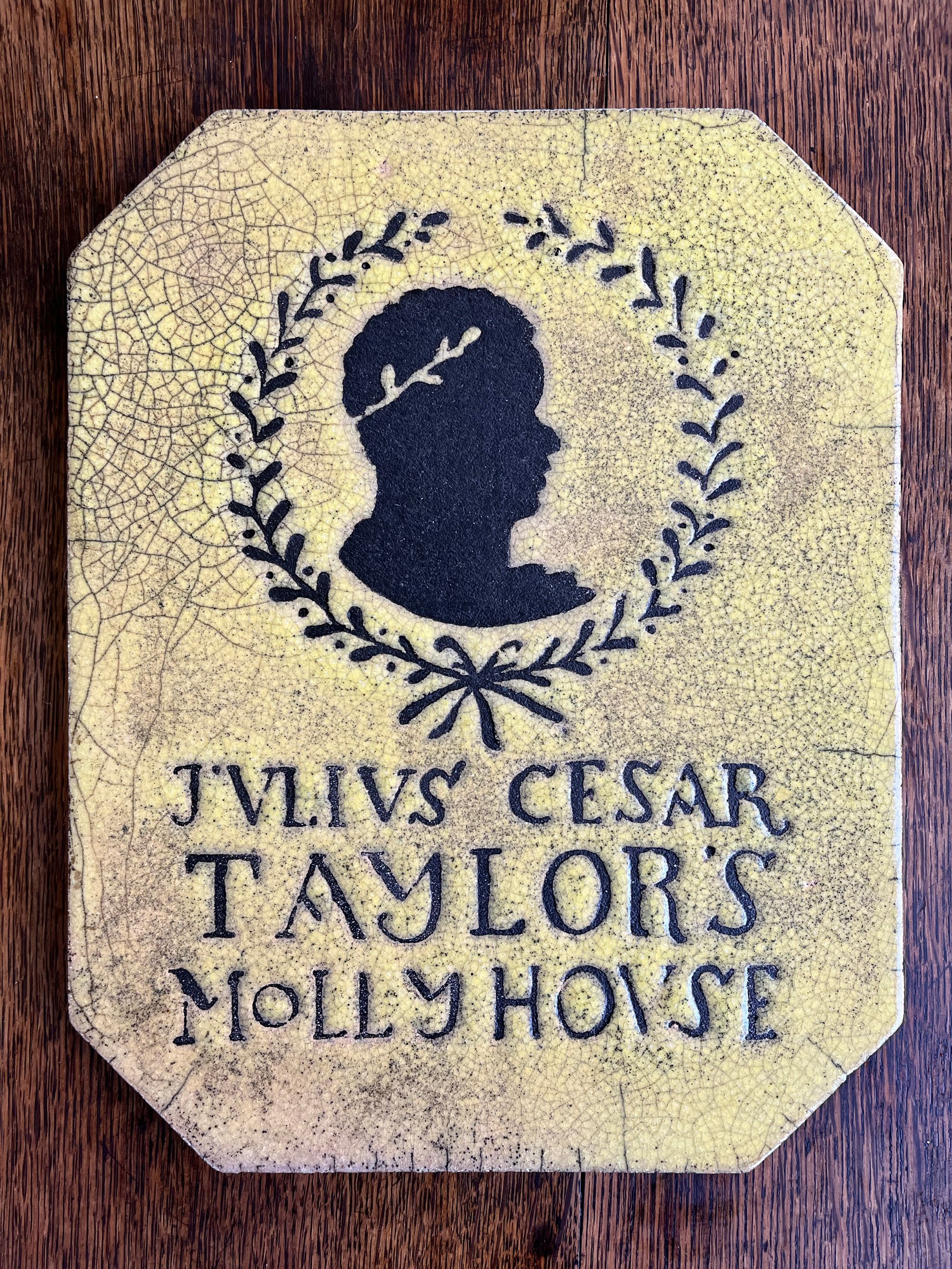 A Raku-fired octagonal plaque in crackled Yellow and Black, commemorating the famous Molly House (an 18th/ 19th Century term for a meeting place/ tavern/ brothel for queer men) run by Julius Cesar Taylor, a freed black slave, located at the bottom end (oo er) of Tottenham Court Road, where it meets modern day Oxford St.