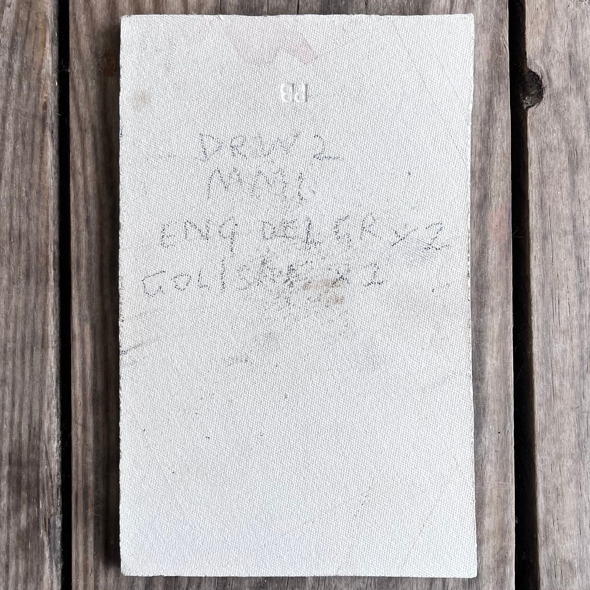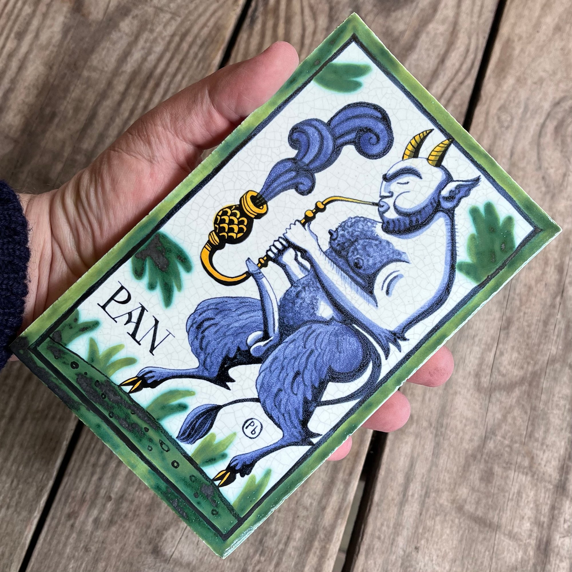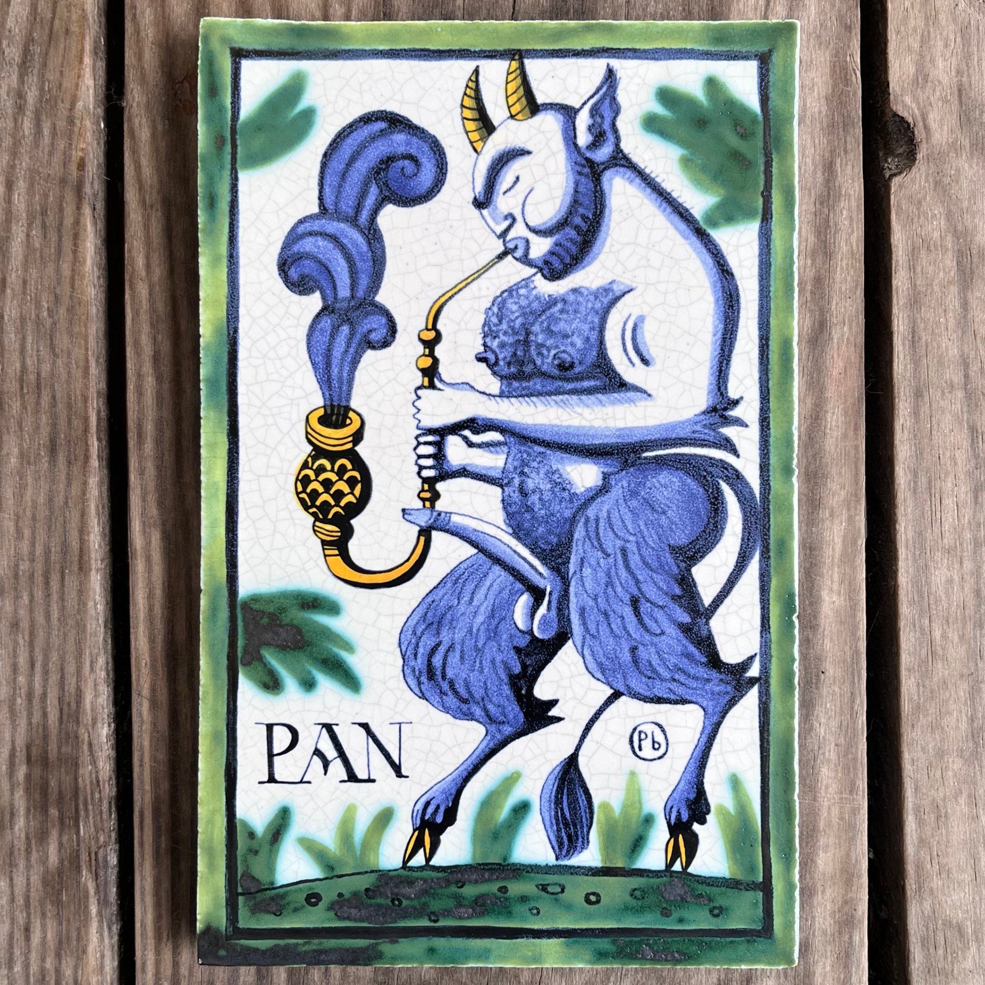 The Great God Pan, puffing hard upon a smoking pipe. Hand-painted delft tile in Cobalt, Copper and Polychrome. Inspired by traditional Spanish tile designs and playing cards. Please note a few small dots of 'burn-out' from fluxing within the oxides and a slight bowing of the piece over all, reflected in the price.