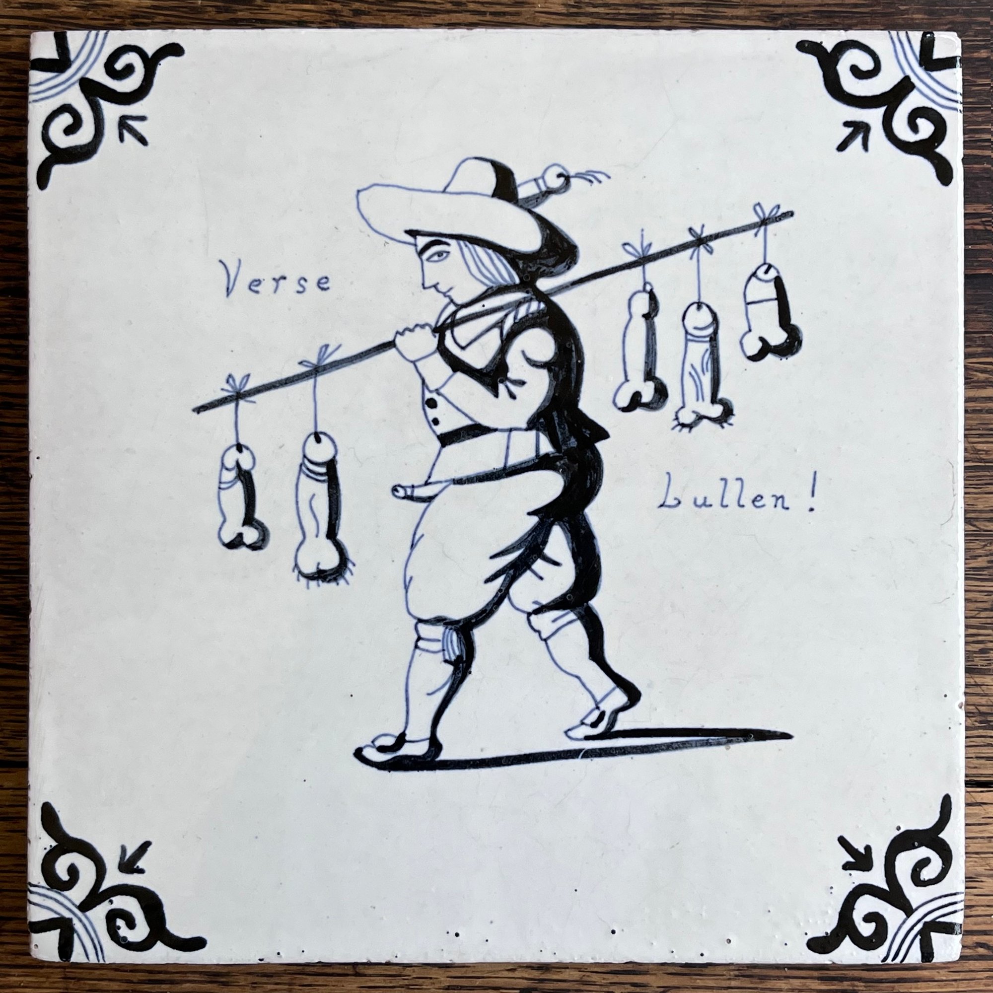 A street seller of Verse Lullen (Fresh Dicks!) peddling his wares. Hand-painted delft tile in Cobalt, with oxhead corner motifs. Inspired by a traditional Dutch design.