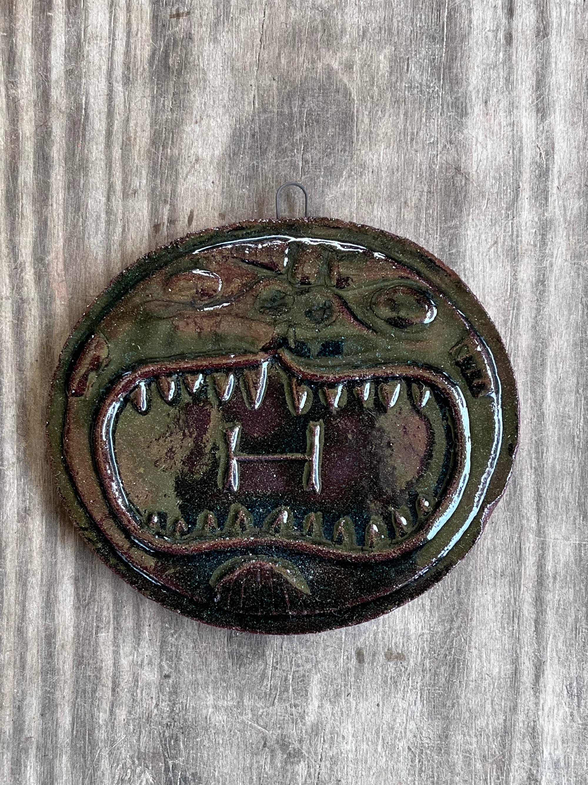 A glazed and moulded ceramic terracotta medallion showing the gaping jaws of a Hell-mouth. Comes with a small metal hoop at the top for hanging.