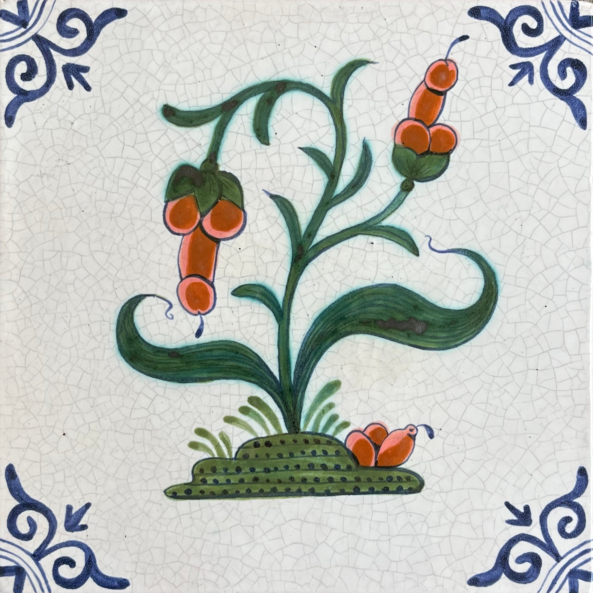 Or, Dick Flower: a whore-ticultural study. Hand-painted delft tile in Cobalt, Copper and Polychrome with oxhead corner motifs. Inspired by a traditional Dutch design.