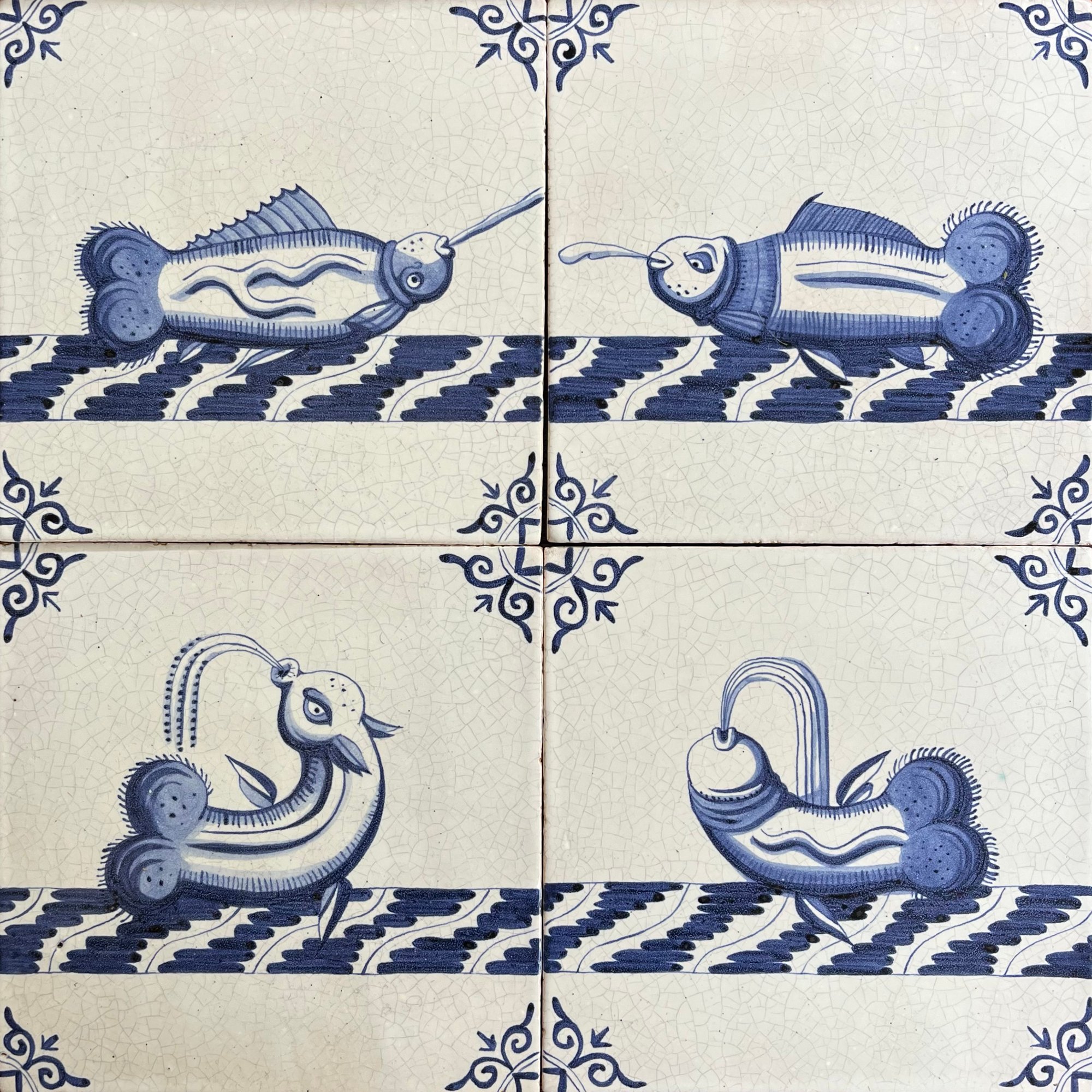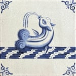 A phallic Sea Monster on the ocean waves. Hand-painted delft tile in Cobalt with oxhead corner motifs. One of four designs. Inspired by a traditional Dutch design.