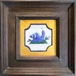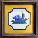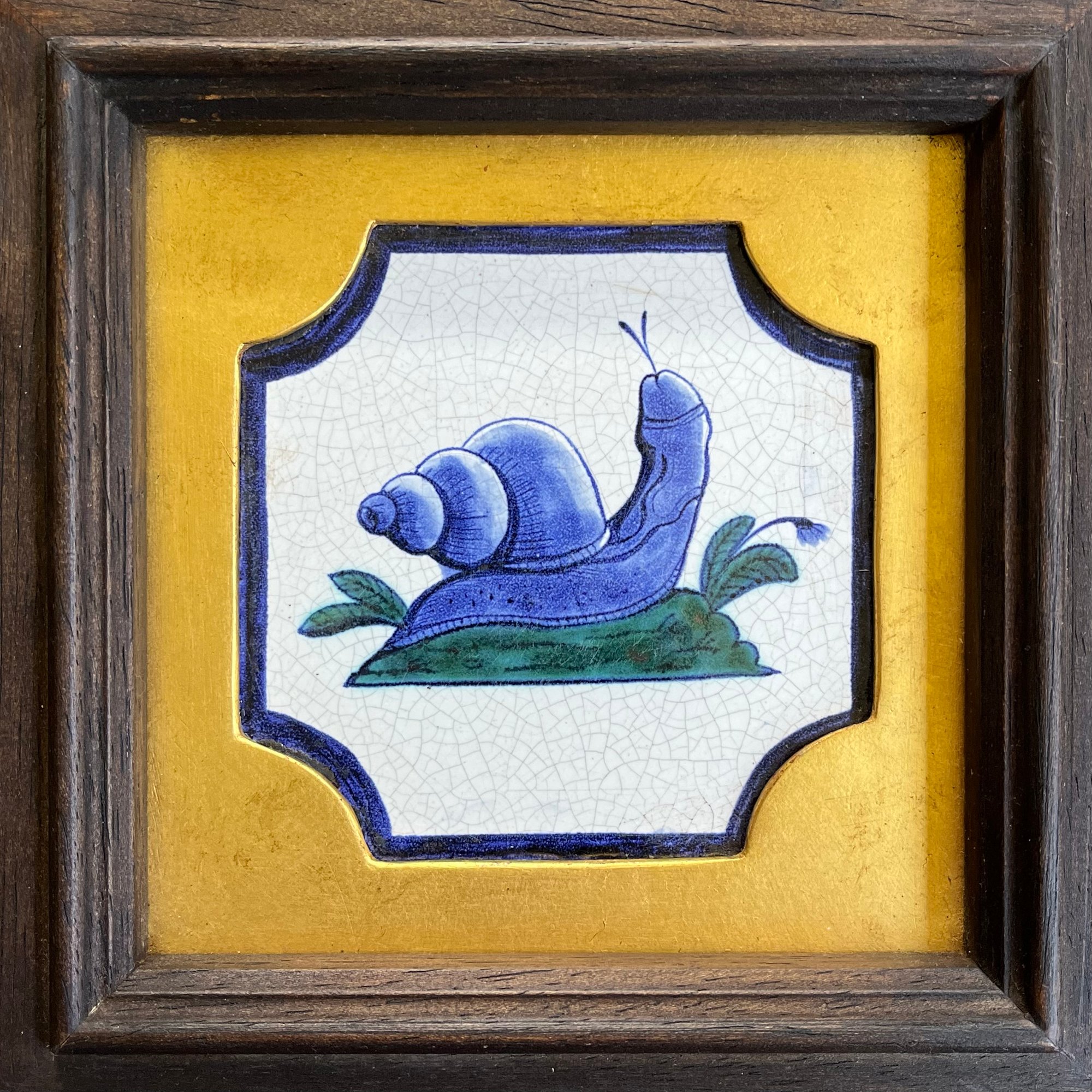 A phallic Snail upon a verdant tussock. Hand-painted delft tile in Cobalt and Copper, inspired by a traditional Dutch design, in a quality wooden-frame with gilded spandrel.