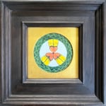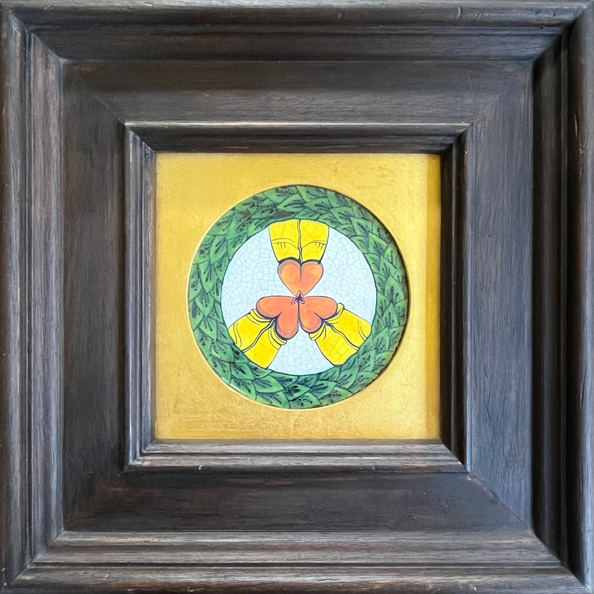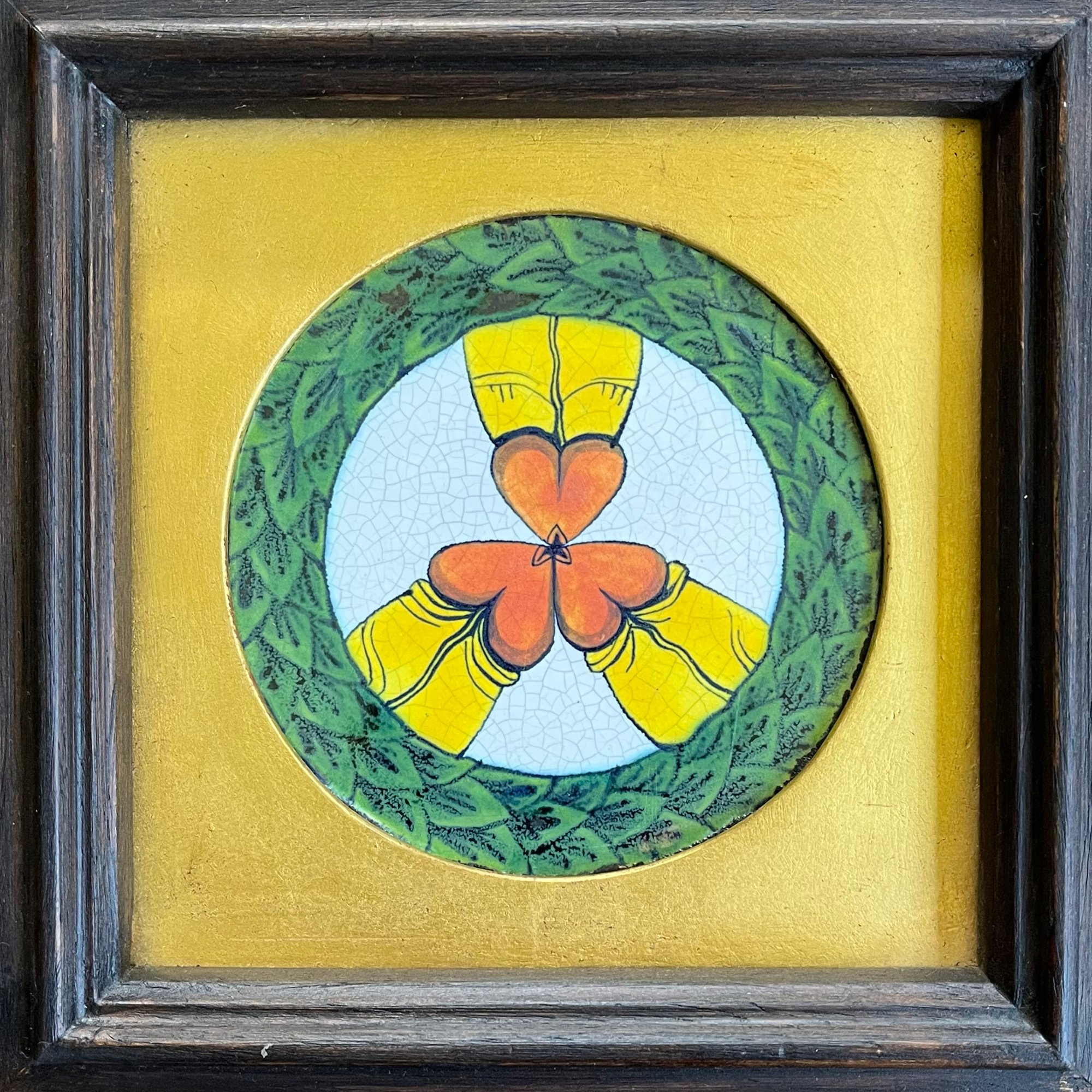 When three 'hearts' meet: a celebration of L'Amour à Trois. Hand-painted delft tile in Cobalt, Copper and polychrome, inspired by a traditional Dutch design, in a quality wooden-frame with gilded spandrel.