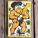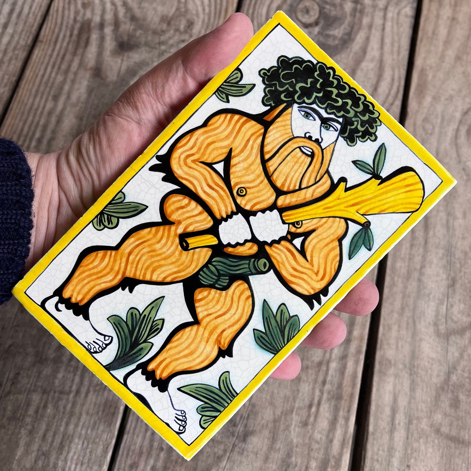 A hairy Woodwose or Wildman of the Woods with crown of leaves and gnarled club aloft. Hand-painted delft tile in Cobalt, Copper and Polychrome. Inspired by traditional Spanish tile and medieval church carving designs.
